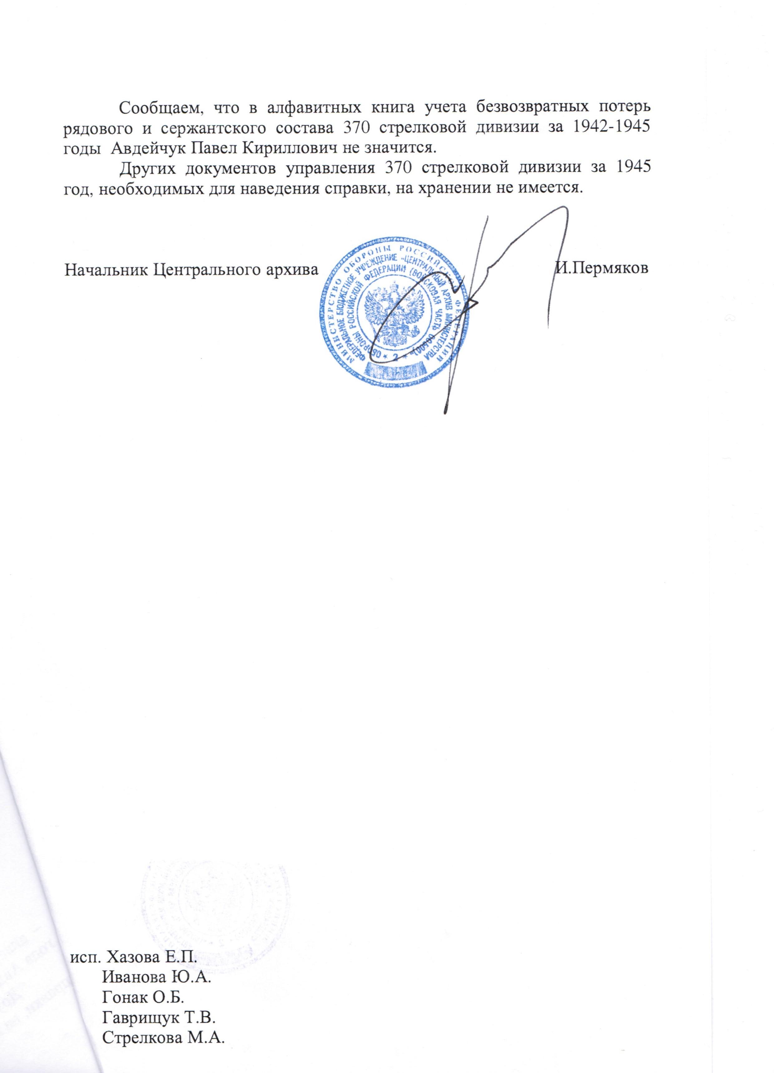 В апреле 2012 года был получен ответ из ЦАМО. Прочитав официальный документ я не мог поверить своим глазам. Ни по документам учета безвозвратных потерь сержантов и солдат Советской армии за период Великой Отечественной войны, ни в приказах по 1234 стрелковому полку, ни в алфавитных книгах учета безвозвратных потерь рядового и сержантского состава 370 стрелковой дивизии за 1942-1945 годы Авдейчук Павел Кириллович НЕ ЗНАЧИТСЯ!