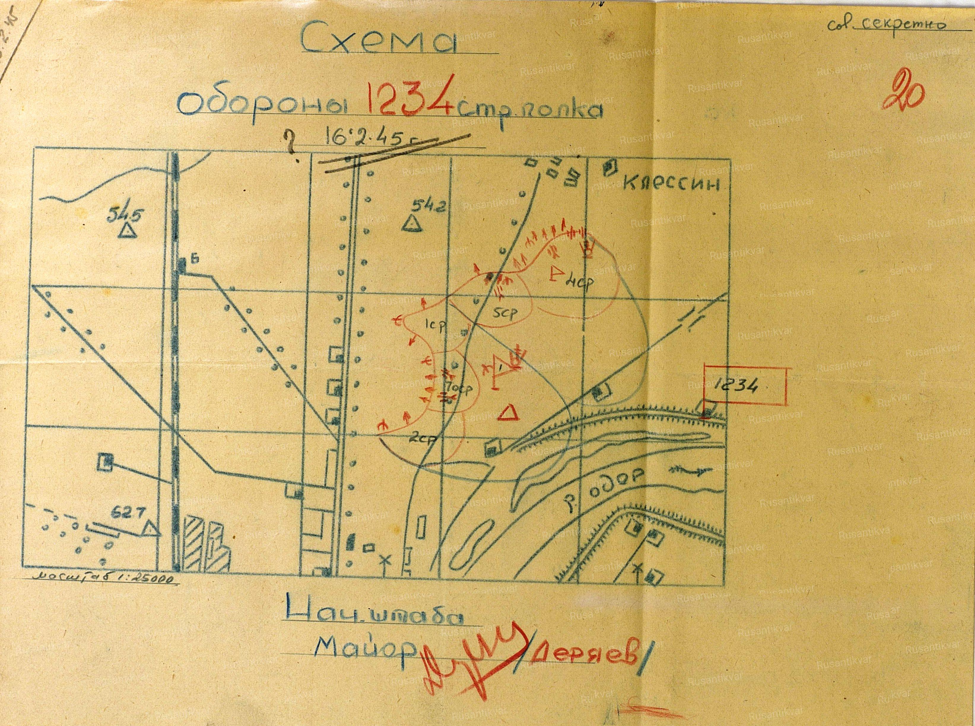 Схема обороны 1234 сп на 16.02.1945 г.