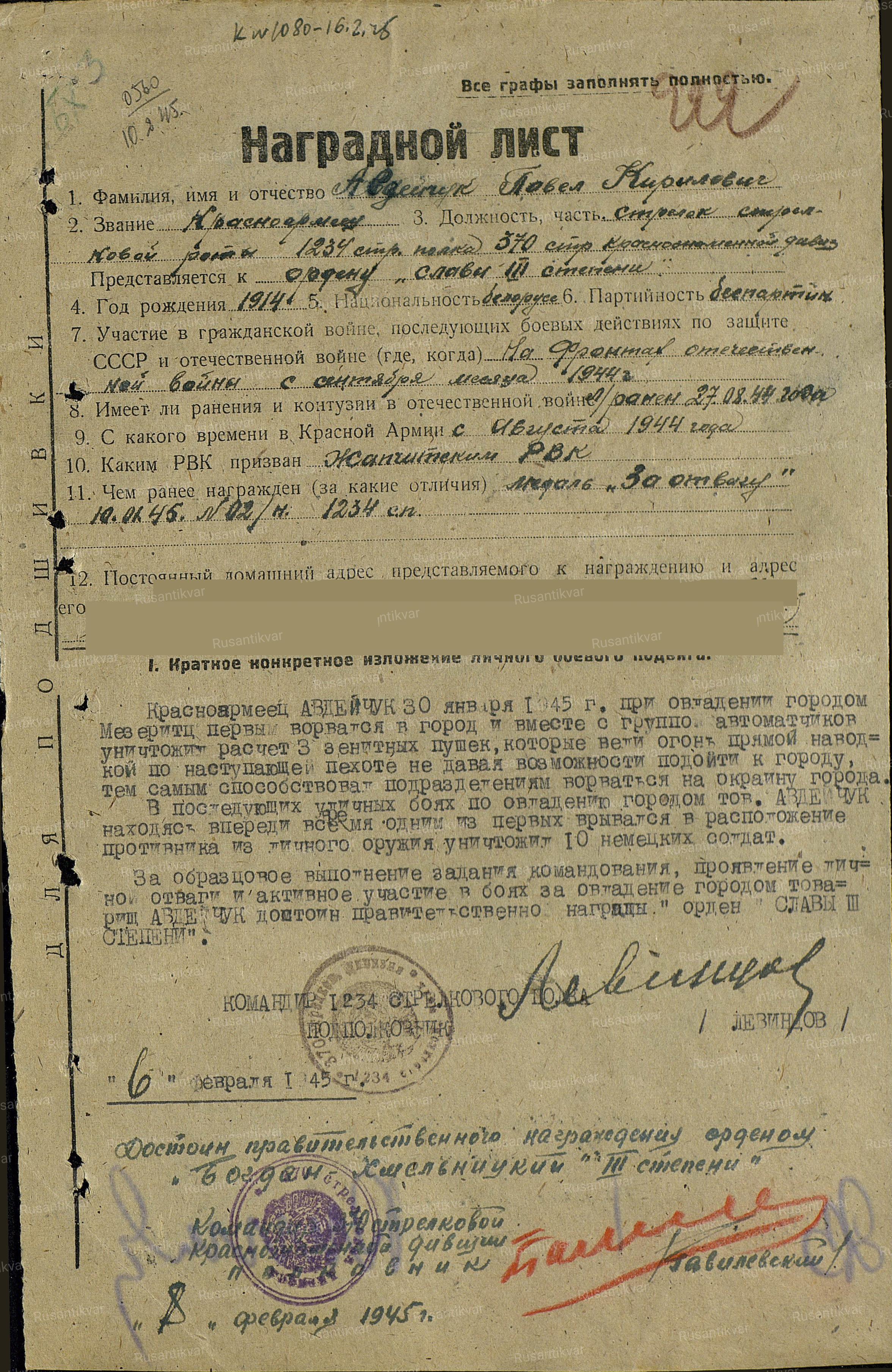 За образцовое выполнение задания командования, проявление личной отваги и активное участие в боях за овладением городом, товарищ Авдейчук достоин правительственной награды - орден Славы, III степени».