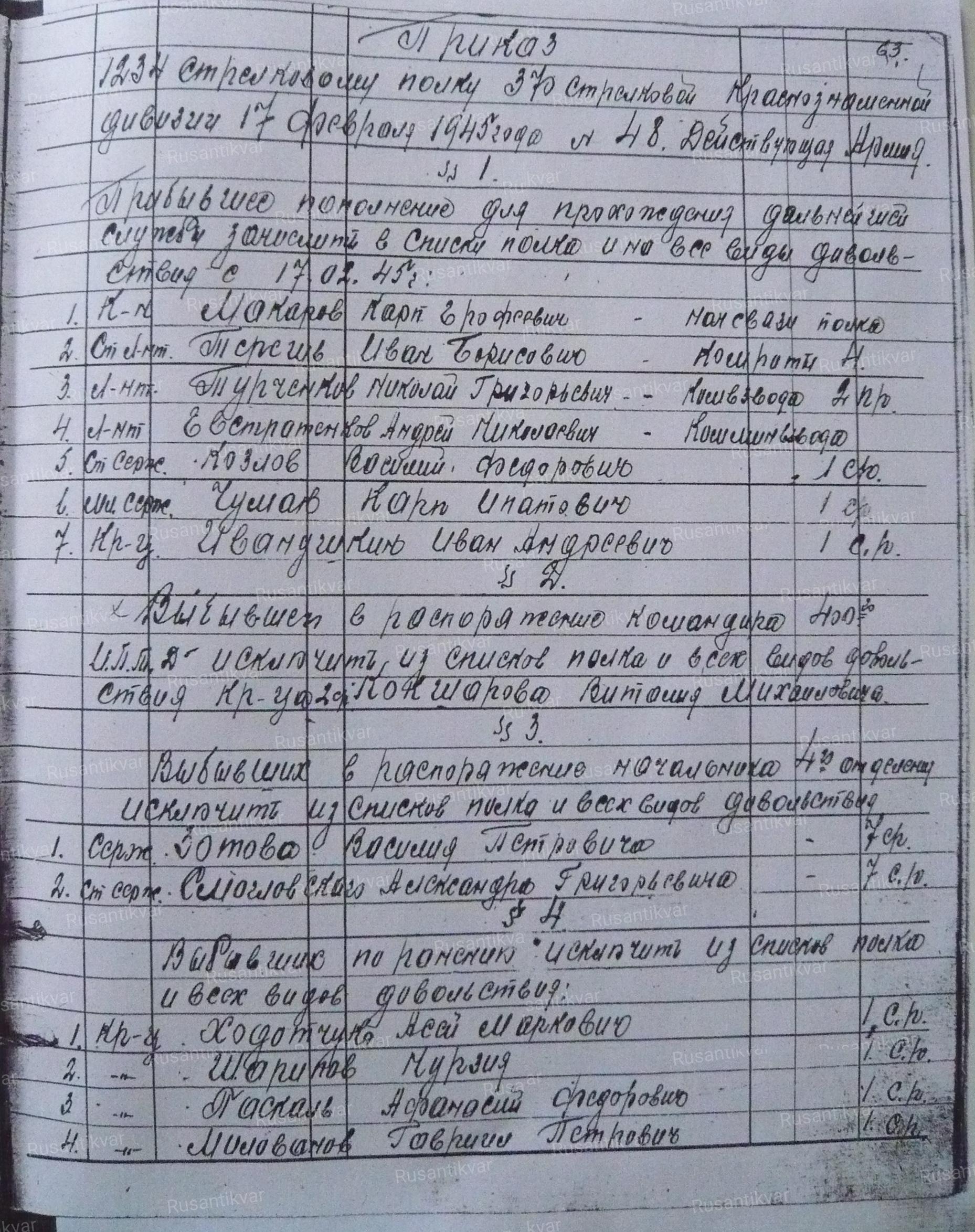 Приказ по личному составу 1234 сп 370 сд от 17.02.1945 г.