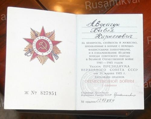 Орденская книжка к ордену Отечественной войны Павла Авдейчука.