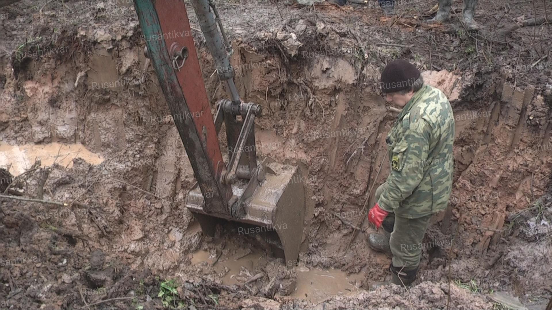 С раннего утра дождливого ноябрьского дня наша небольшая экспедиция приступила к делу. Приехал на своем верном «Петушке» (трактор ЮМЗ с экскаватором) наш механик-водитель Виктор Белов, а мы втроем с товарищами взялись пропиливать дорогу к обнаруженному месту падения самолета. Медленно, но верно трактор по хлипкому наспех сделанному настилу (местность – низменная, заболоченная) дополз до места и устроился у воронки, приготовившись к продолжительной работе. Подтянулись и наши хорошие знакомые – новгородские журналисты. Под импровизированным навесом они установили камеру, и работа началась. «Петушок», управляемый опытной рукой, раз за разом вонзал свой ковш в жидкую перемешенную с частями самолета глину. Наша с ребятами задача была оперативно, с помощью лопат и крюков, разбирать вынутый из воронки грунт. Увлекшись работой, никто из нас не замечал ни жидкой с разводами масла грязи ни противного холодного дождика, сыпавшего с неба.