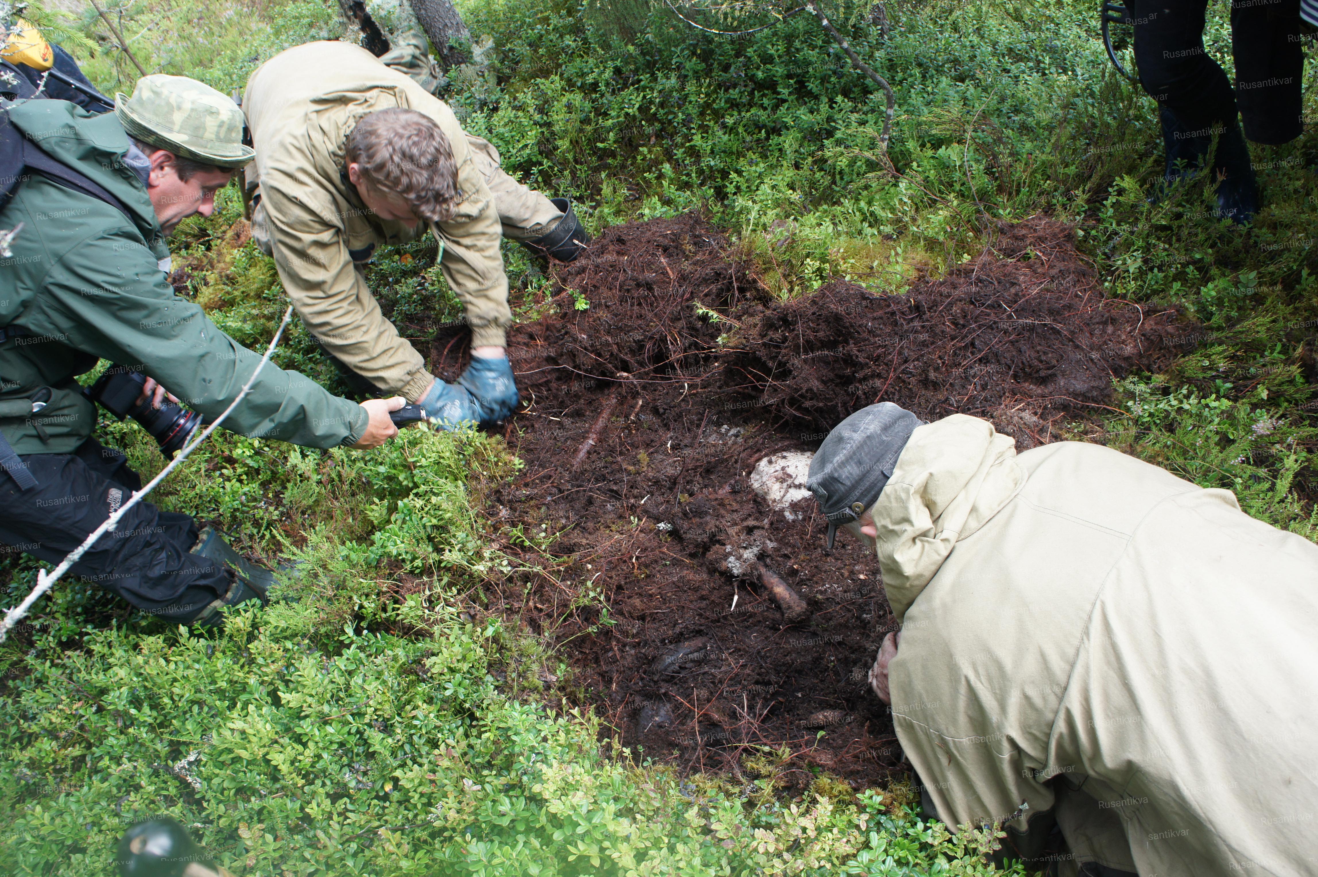 На следующий день возвращаемся к этому месту уже всем отрядом, за исключением лагерных дежурных. Останки солдата были расположены компактно, не разбросаны. Аккуратно снимаем мох и дерн, продвигаясь к грудной клетке, где могли оказаться какие-либо личные вещи. Чуть в стороне обнаруживаем остатки ткани вещмешка и перочинный ножик. Но последняя надежда, всколыхнувшаяся было, почти сразу угасает — никаких следов подписи на ножике обнаружить не удаётся.