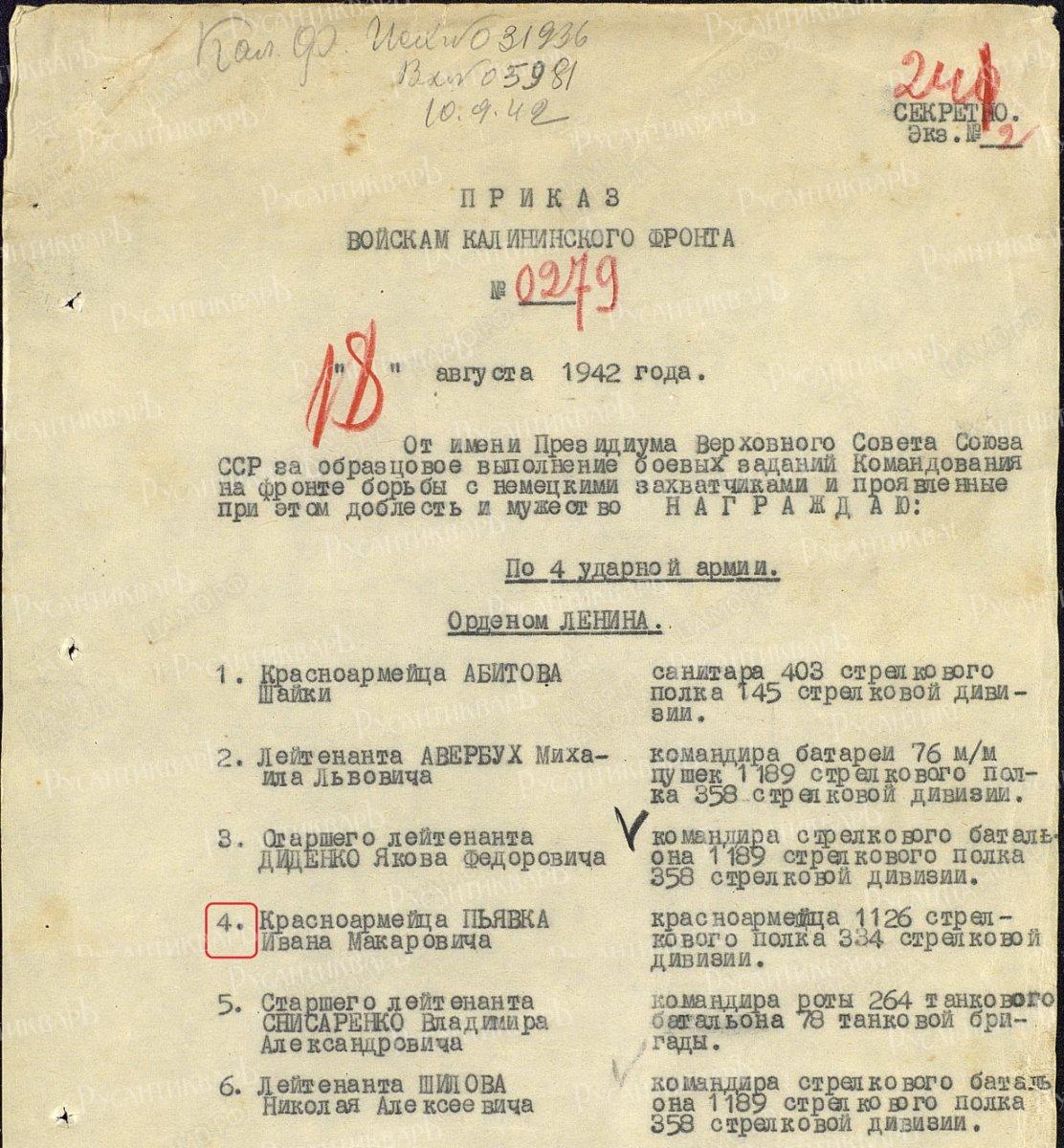 В конце этого документа называется общее количество награждённых бойцов и командиров по каждой награде. Лишь один воин назван поименно: «орденом Ленина награждён павший смертью храбрых красноармеец Пьявка». Он единственный награждён орденом Ленина, что говорит о высоком статусе награды и о том, что И.М. Пьявка действительно совершил подвиг. Тут впору было представлять к званию Героя Советского Союза, с учётом одного лишь захвата немецкого полкового знамени.