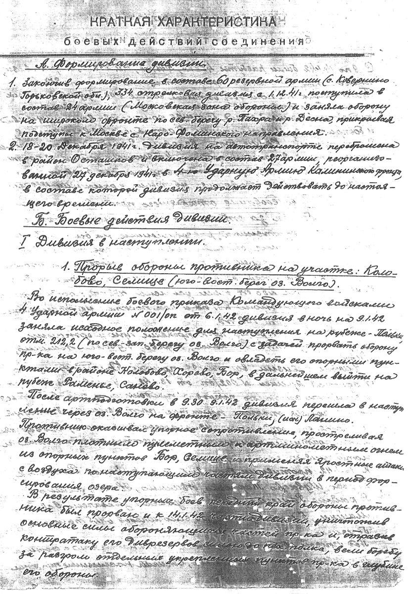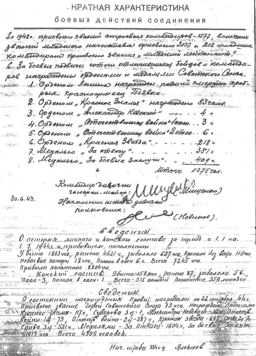 Оставим разночтения в воинском звании, дате смерти на совести тех, кто писал. В пылу боёв, видимо, было не до этого. Для понимания хотя бы в какой-то степени происходившего в те дни процитирую небольшой отрывок из отчёта о боевых действиях 334-й стрелковой дивизии, который будет составлен 30.06.1943 г. и подписан командиром этой дивизии, уже генерал-майором Н.М. Мищенко, начальником штаба дивизии полковником Ю.З. Новиковым. Даю так, как в оригинале: