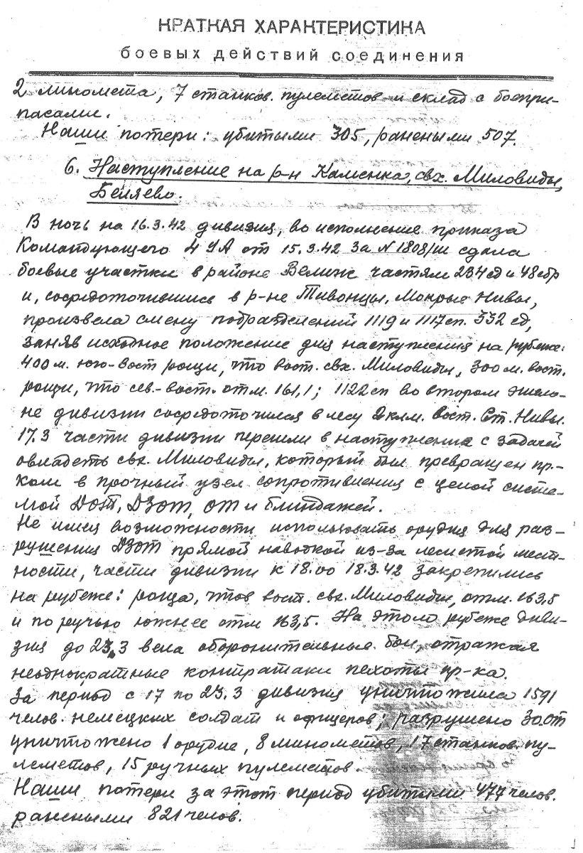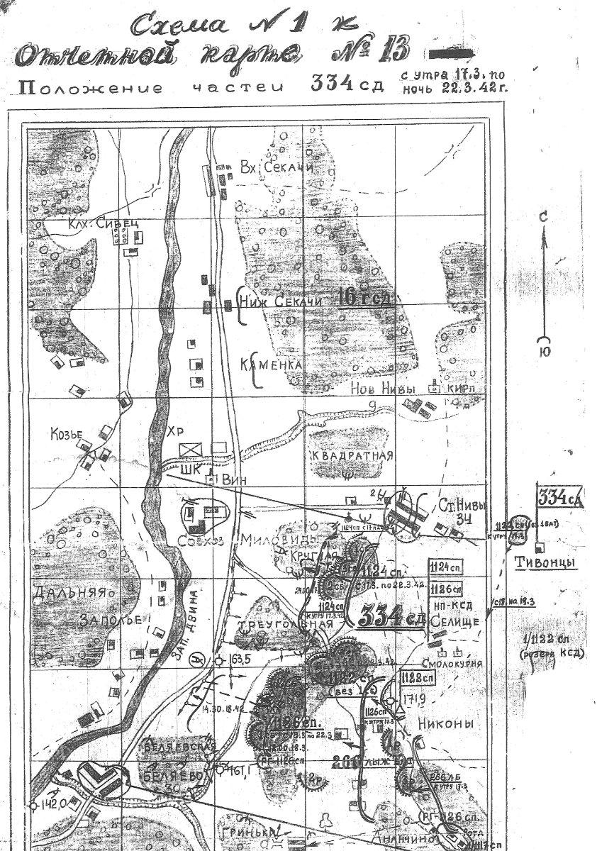 В ночь на 16.3.42 дивизия, во исполнение приказа Командующего 4 УА от 15.3.42 за № 1808/ш сдала боевые участки в районе Велиж частям 234 сд и 48 сбр и, сосредоточившись в р-не Тивонцы, Мокрые Нивы, произвела смену подразделений 1119 и 1117 сп 332 сд, заняв исходное положение для наступления на рубеже: 400 м юго-вост. рощи, что вост. свх. Миловиды, 300 м вост. рощи, что сев-вост. отм. 161,1; 1122 сп во втором эшелоне дивизии сосредоточился в лесу 2 клм вост. Ст. Нивы.