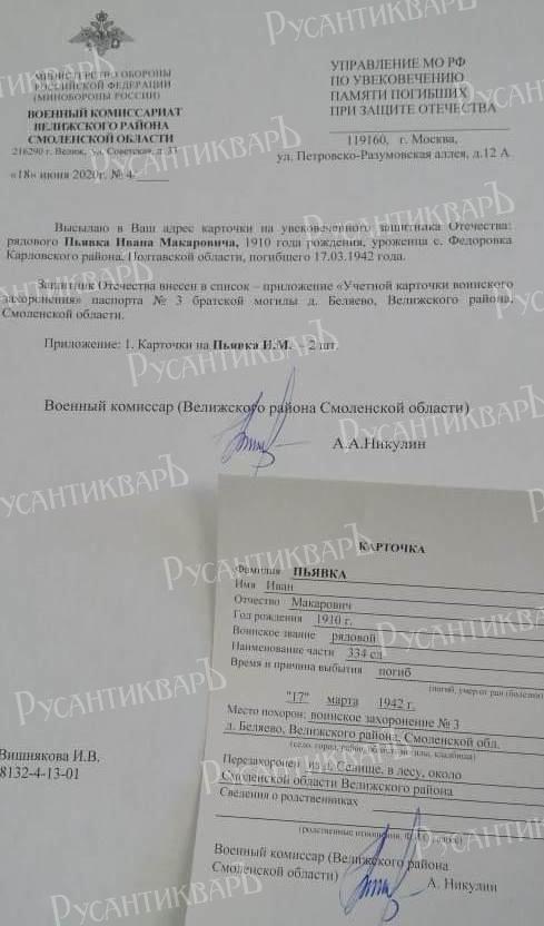 Война закончилась. И, спустя два года, 23.06.1947 года Карловский РВК Полтавской области, тот райвоенкомат, откуда призывался И.М. Пьявка, направляет именной список безвозвратных потерь по району в адрес начальника управления по учету погибшего и пропавшего без вести рядового и сержантского состава. В нём Иван Макарович значится как пропавший без вести в 1941 году. Его разыскивает жена Евдокия Максимовна, проживающая в с. Федоровке Карловского района.