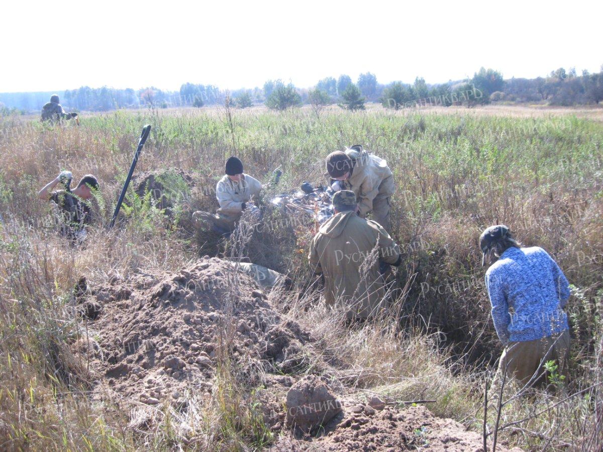 Поисковые работы начались 22 сентября. На арендованном микроавтобусе мы выезжали в разные точки Севского района, с целью проверки сведений о забытых воинских захоронениях, собранных в течение года севскими поисковиками у местных жителей. С помощью металлоискателей, щупов, отрывки большого количества шурфов были обследованы места предполагаемых забытых захоронений у сёл Сенное, Юрасов хутор, Гапоново, Земледелец и Шведчики.