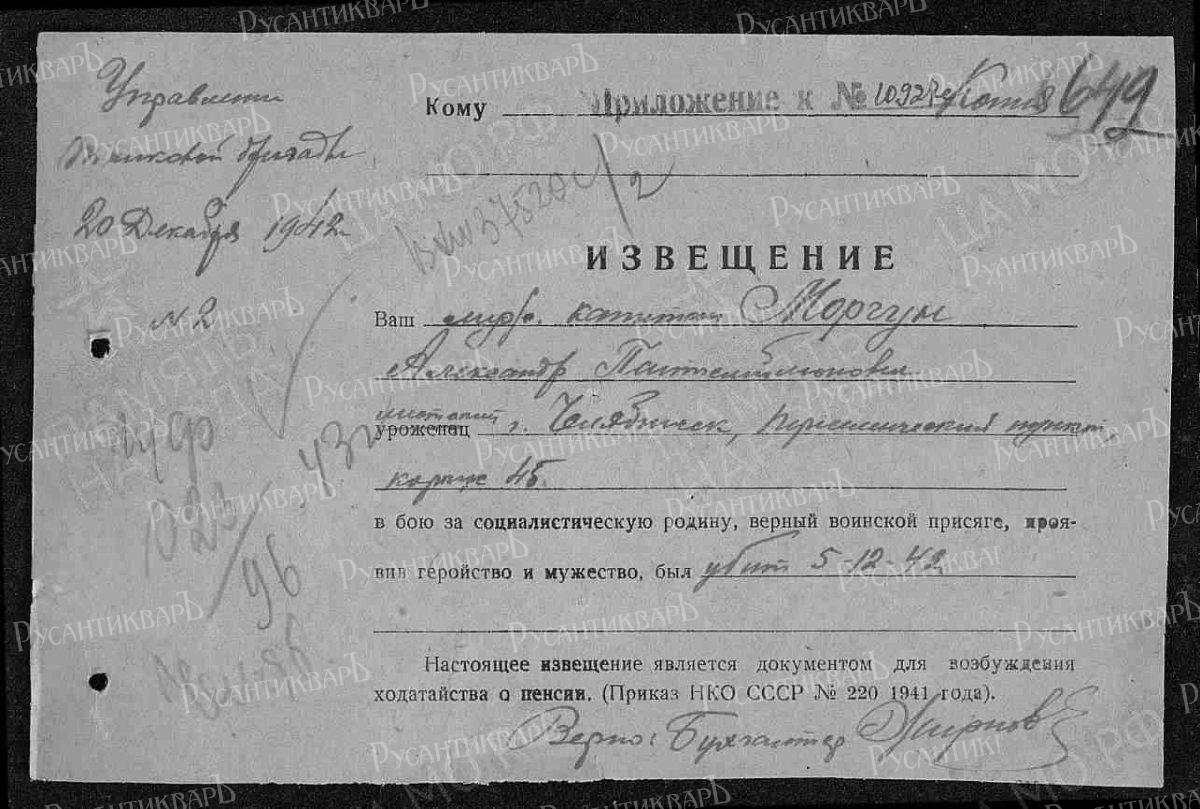 За бои 5 декабря 1942 года капитан Моргун посмертно представлен к ордену Отечественной войны II степени: