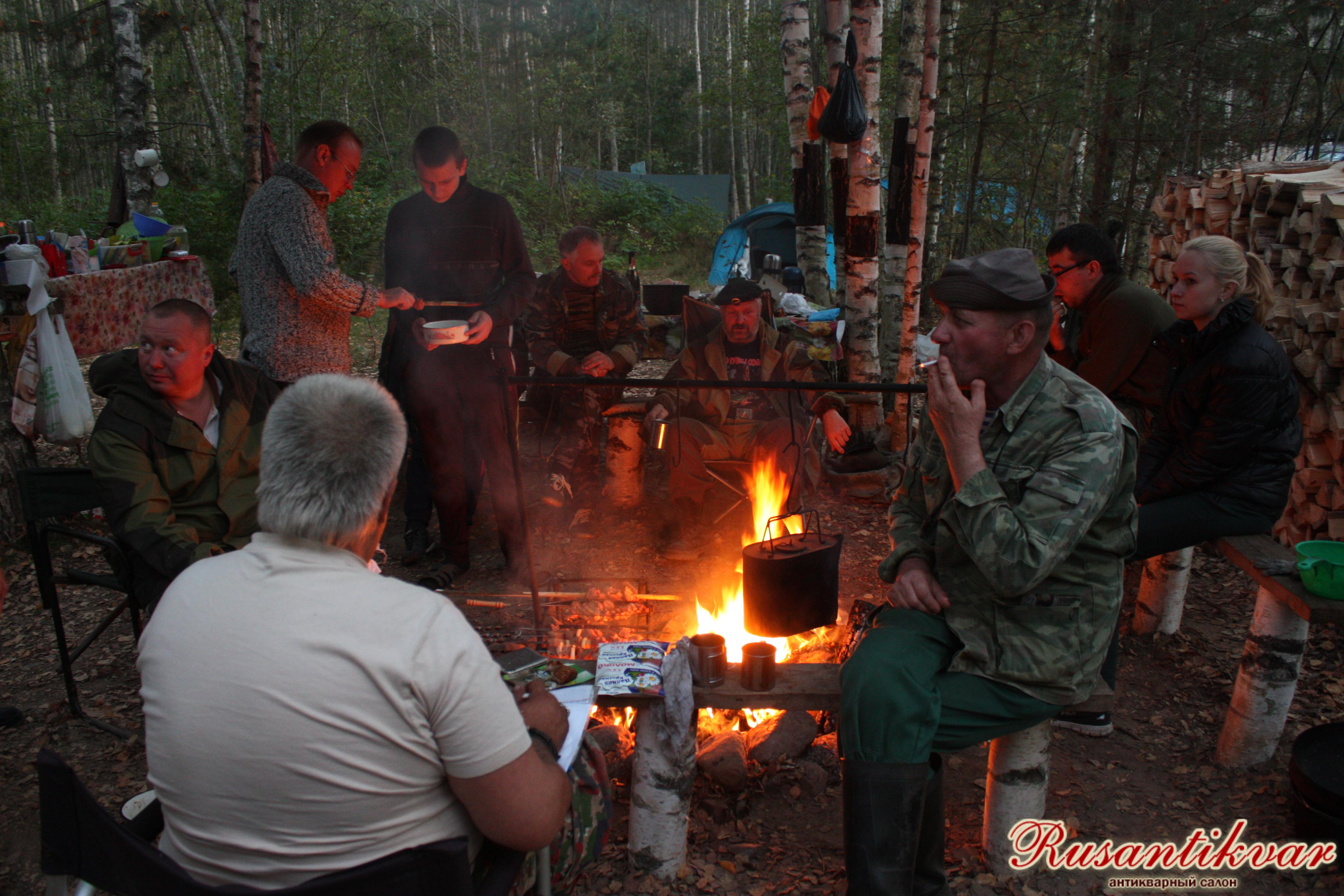 За разговорами и воспоминаниями вечер переходит в ночь, а ночь иногда - в утро. Сентябрьский ночной холод сдвигал всех ближе к костру. На нём постоянно жарилось мясо, грибы, варился суп, макароны с тушёнкой, кипел большой закопчённый чайник с двумя ручками. Иногда вместо чайника к костру выносили и раскочегаривали большой жёлтый самовар. Из его трубы, как из сопла ракеты, к небу рвалось красное пламя. Такое же пламя выходило из трубы штабной палатки, где собирались молодые поисковики посмотреть на сон грядущий кино про войну и зарядить мобильные телефоны. Розетки, DVD-проигрыватель и лампочки около костра питал генератор, который рычал в лесу, за палатками.