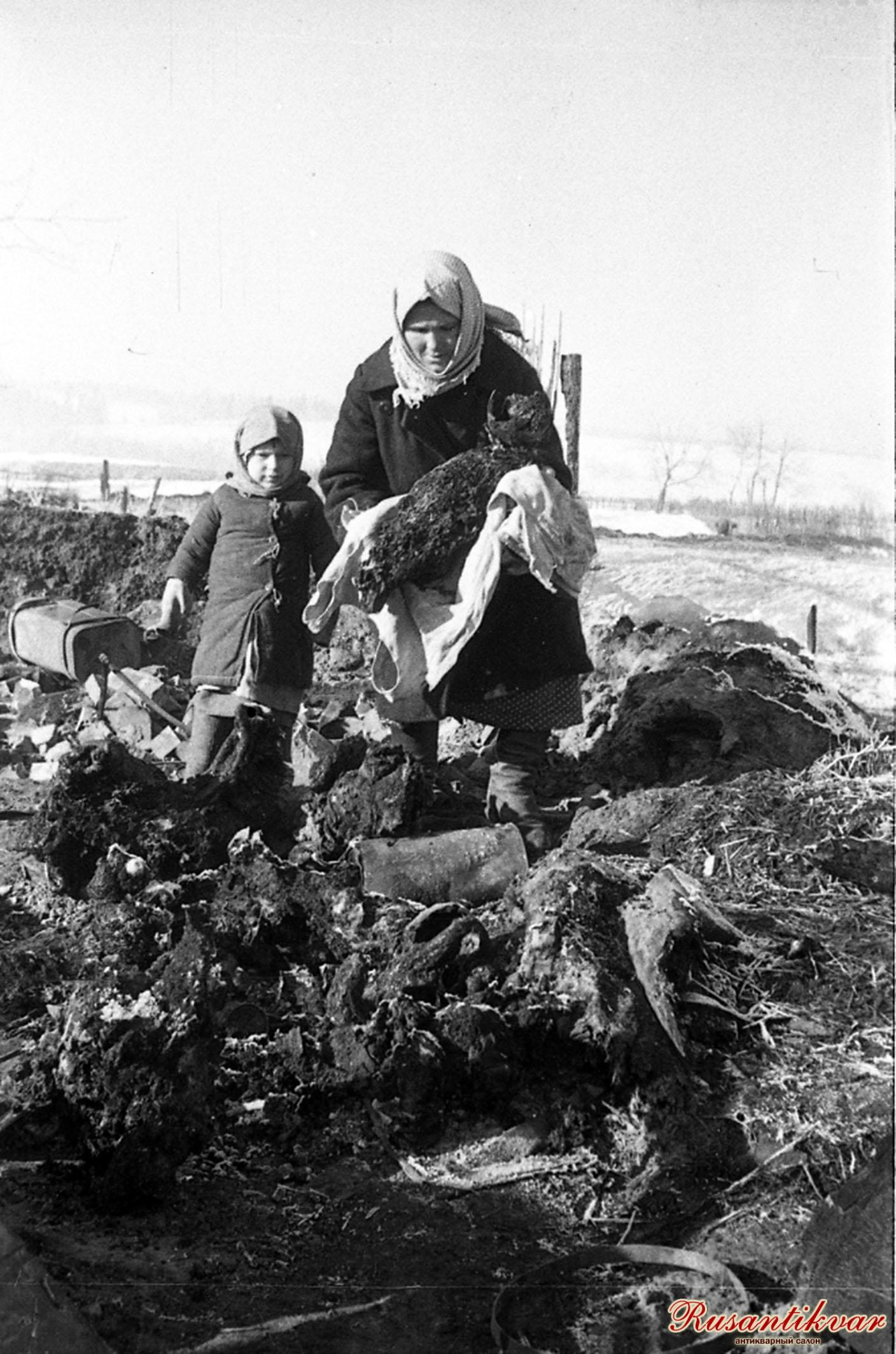 Фото 2. Жительница деревни Осташково Издешковского района у обгорелого трупа своей матери, сожжённой фашистскими извергами. 1943 год. (РГАКФД)