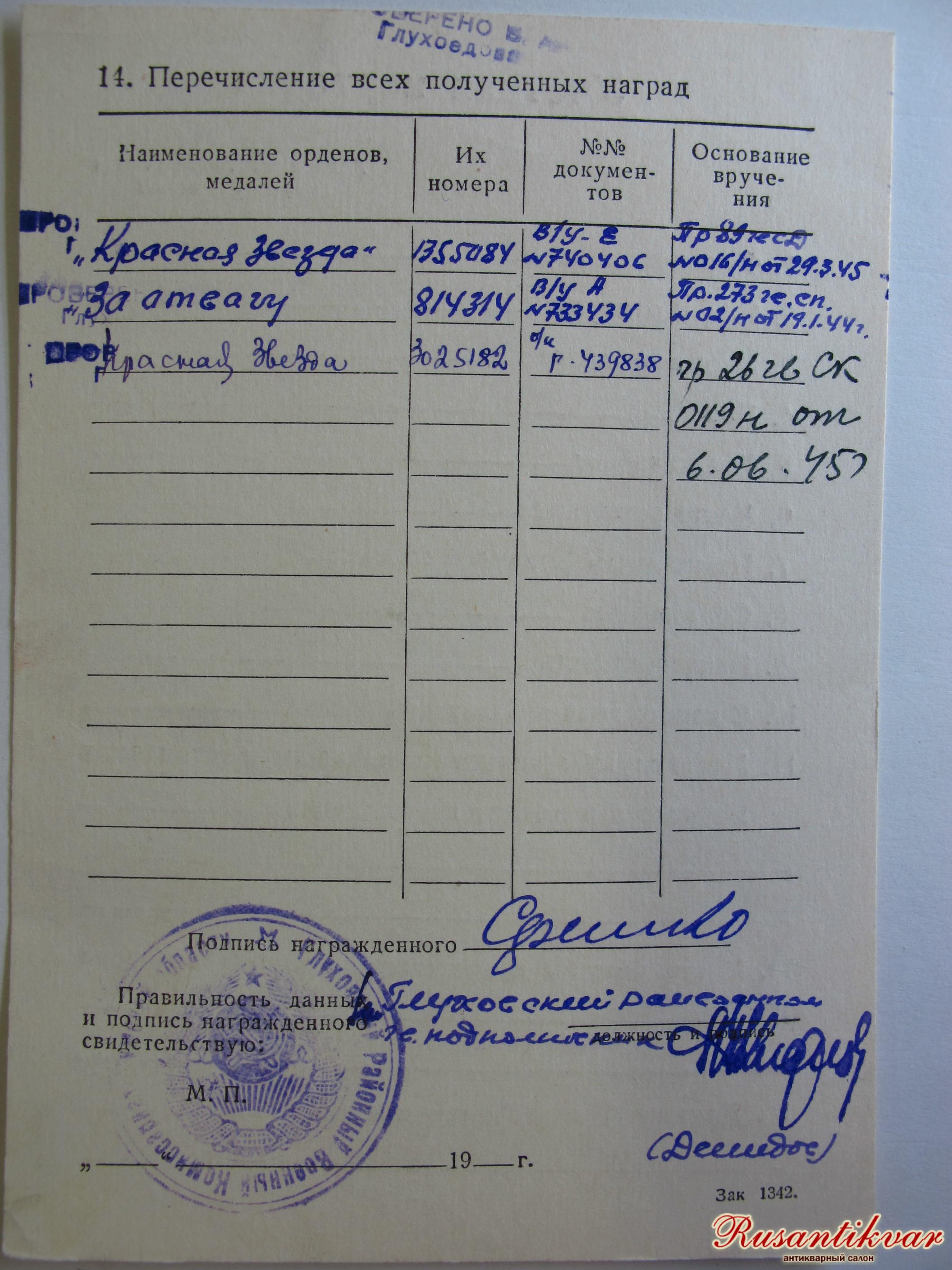 2.Оборотная сторона учётно-послужной карточки гвардии старшины Сергиенко.