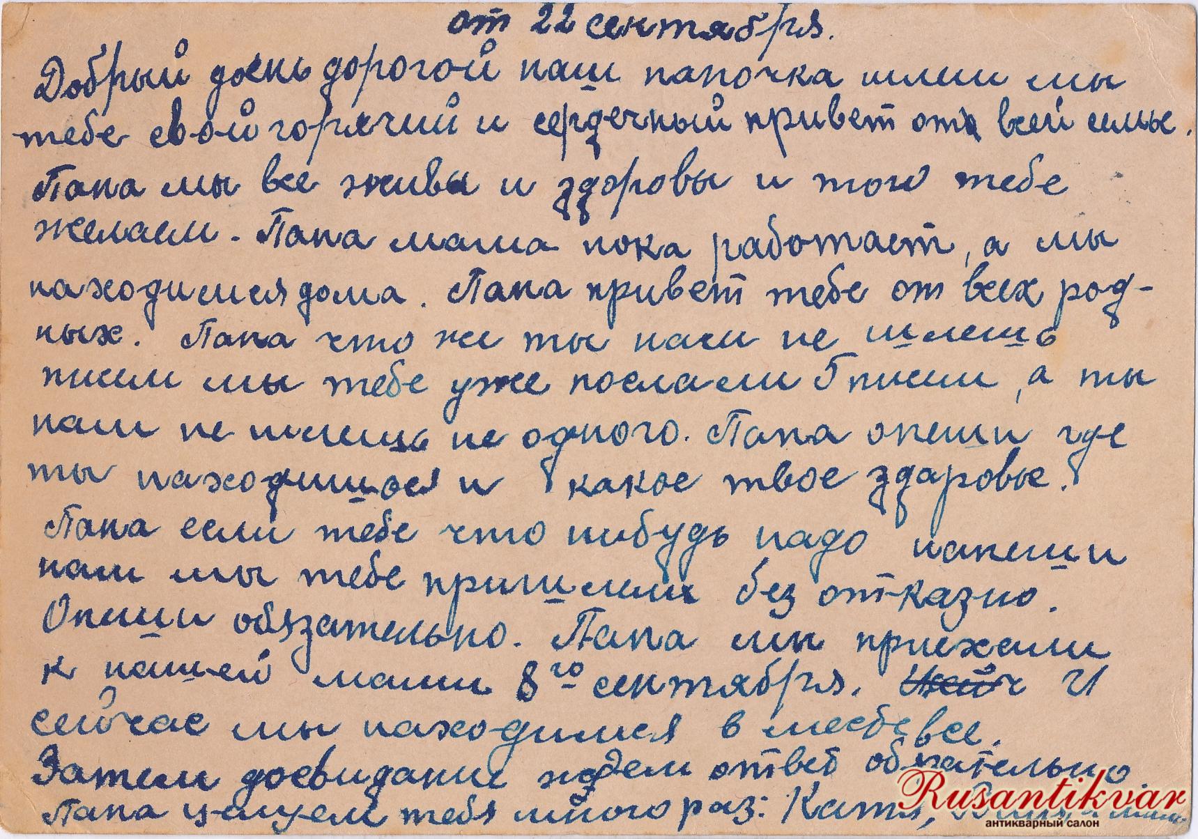 «Добрый день, дорогой наш папочка, шлем мы тебе свой горячий и сердечный привет от всей семьи. Папа, мы все живы и здоровы, и того тебе желаем. Папа, мама пока работает, а мы находимся дома. Папа, привет тебе от всех родных. (…) Папа, опиши, где ты находишься и какое твое здоровье. Папа, если тебе что-нибудь надо, напиши нам, мы тебе пришлем безотказно. (…) Папа, целуем тебя много раз: Катя, Валя и мама».
