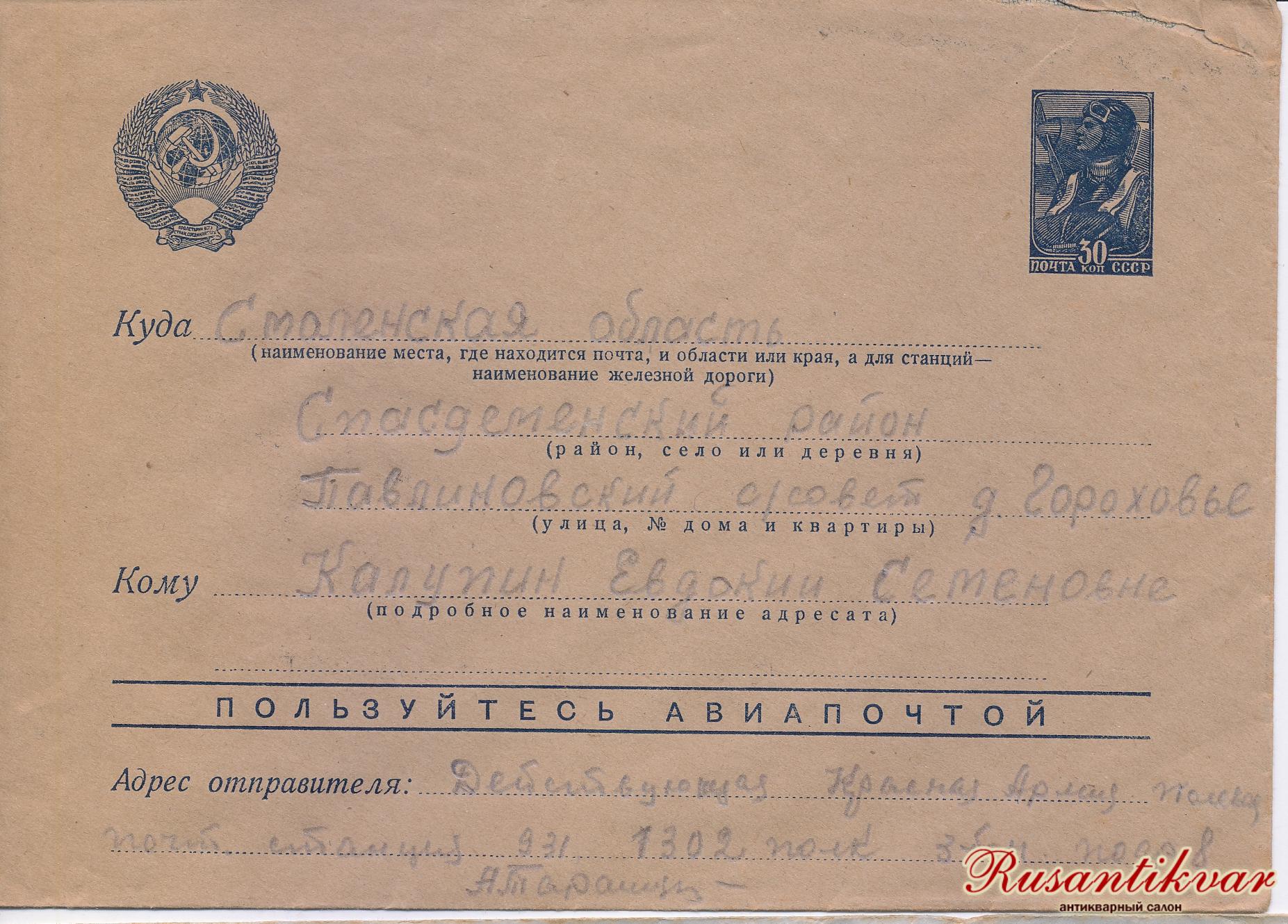 Адрес отправителя: Действующая Красная армия, Полевая почтовая станция 931, 1302 СП, П.В.О. Темкину