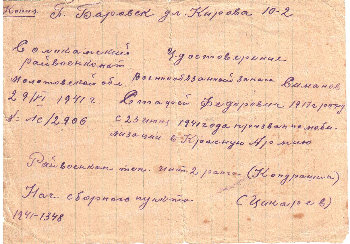 Симонов Степан (Стафей) Фёдорович - копия удостоверения из РВК.