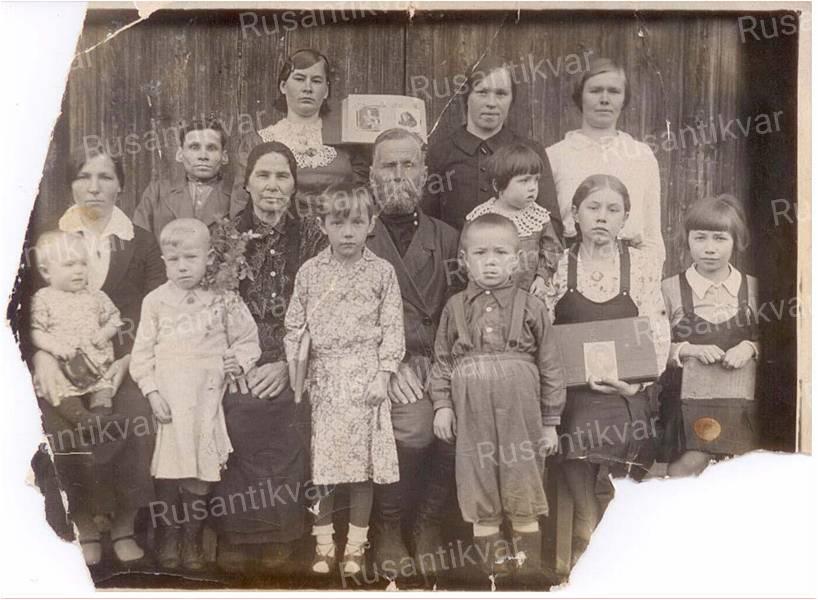3. 1927 год. Семья Пермяковых. Стоят во втором ряду (слева направо) – Иван, Петр, Александр, Дмитрий. 1-й ряд – Василий (инвалид с детства), Иван Аввакумович, Николай, Евдокия Трофимовна, Павел (сидит на коленях у матери), Ольга, Константин. Здесь нет дочери Тони.