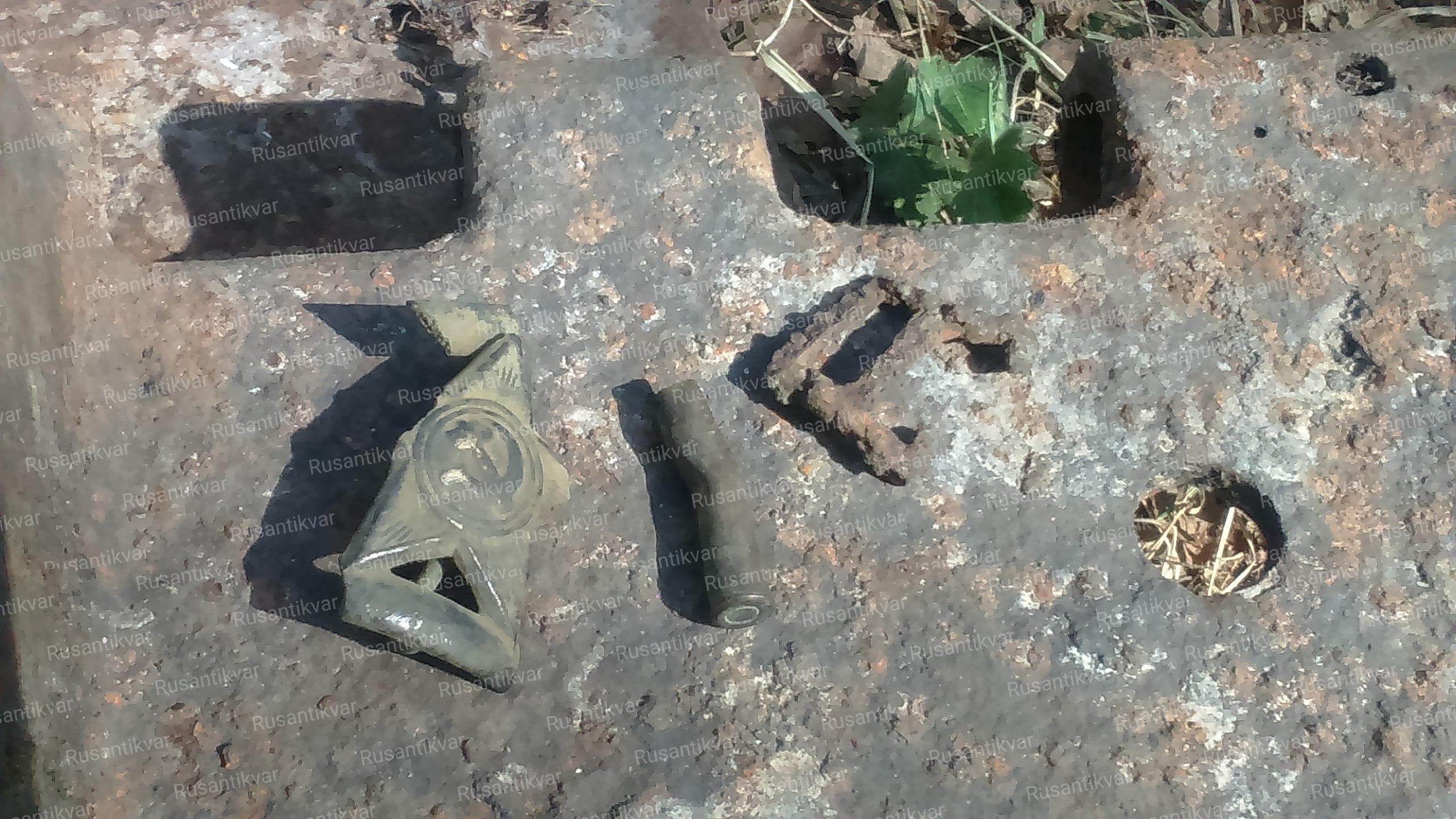 На старой лесной дороге, рядом с небольшой воронкой, были найдены части гусениц, башенный люк, фрагменты оптических приборов, рваные осколки снарядов и горелые патроны. По находкам определили, что у танка взорвался боекомплект. Также найдены человеческие останки и пряжка офицерского ремня, сильно поврежденная взрывом.