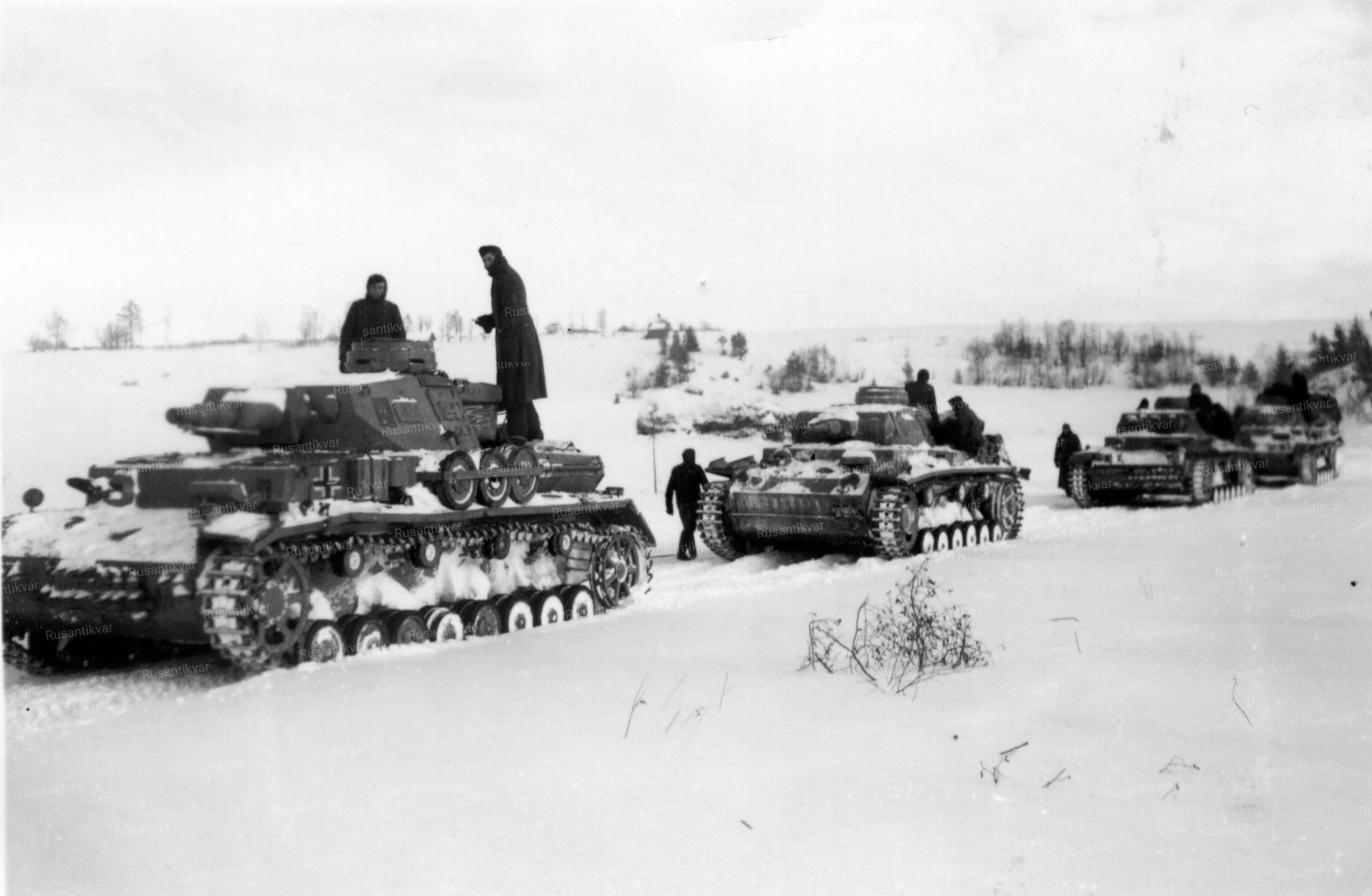 1. Танки 5-й танковой дивизии вермахта. На башнях видна эмблема дивизии «Красный дьявол». Просьба о включении этой дивизии в ХХХХ танковый корпус была отклонена командованием 4-й танковой группы.