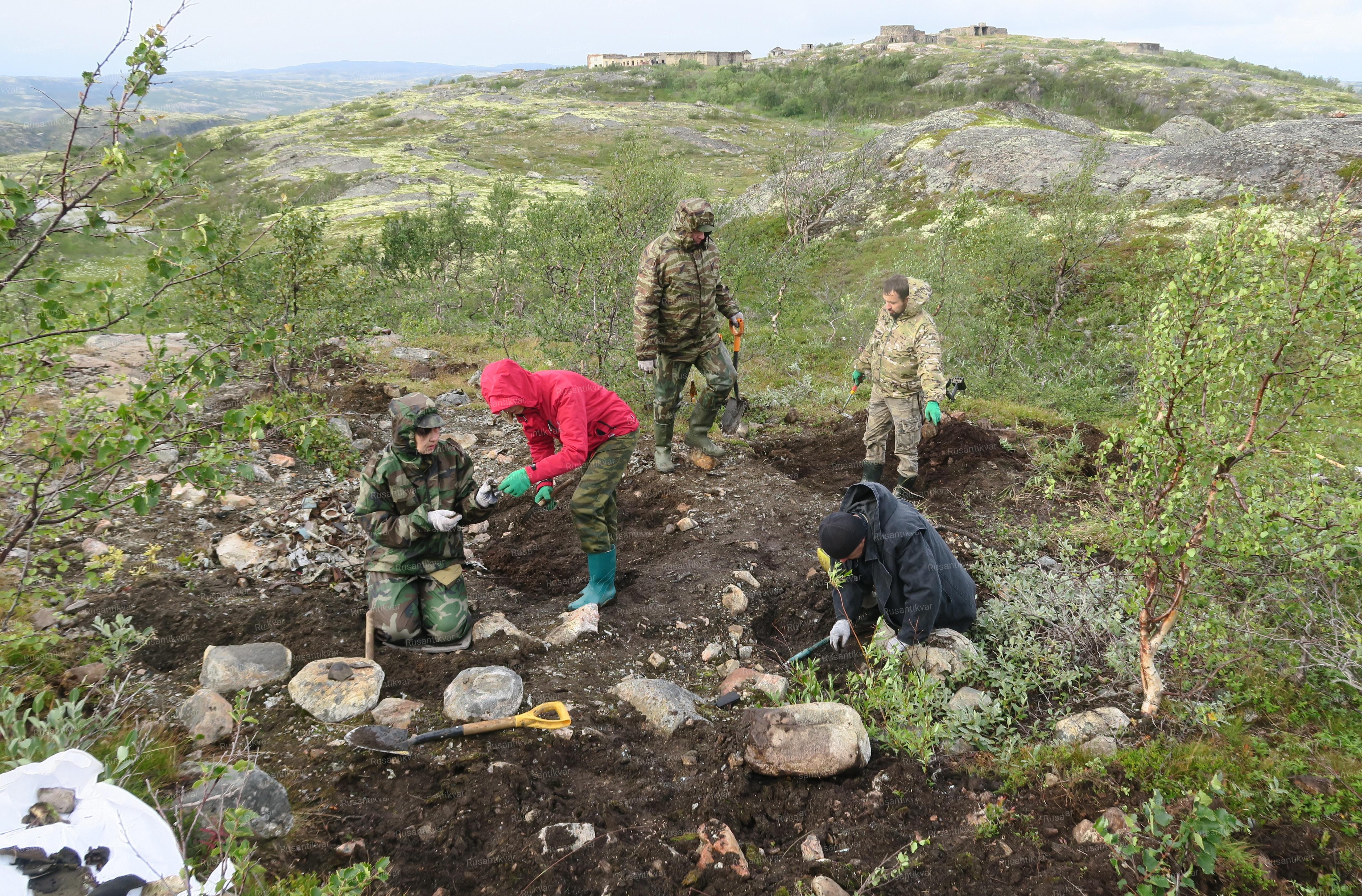 На следующий день наша объединенная команда, захватив необходимое оборудование, выдвинулась к месту падения самолета. Площадка, на которой предстояло работать, располагалась на горной гряде с выступающими острыми скальными породами, в 500 м. юго-восточнее высоты Черная. Вниз, в сторону подножья высоты, уходила неширокая лощина, поросшая карликовыми березками и ягодником вперемешку с подложкой ягеля. Сразу бросились в глаза выступающие из подо мха ржавые остовы крупных силовых элементов самолёта, сползшие, видимо, с весенними снегами вниз по лощине. На самой площадке, в точке соприкосновения самолёта с землей, весь грунт в радиусе 15-20 м. был просто нашпигован искореженным металлом, а куски изломанного дюраля виднелись среди камней на удалении более 30 м от эпицентра. В ходе поисковых работ по зачистке места падения были подняты многочисленные фрагменты дюралевой обшивки самолёта, усилители конструкции, всевозможные трубопроводы, элементы авиационного электрооборудования, части радиостанции, тросики управления. Были найдены кронштейны крепления бортового вооружения, патроны калибра 7.62 мм в разорванных лентах. Стальные детали имели сильную коррозию, детали из дюралюминия местами были сильно оплавлены и обожжены, хотя на некоторых сохранились следы заводской краски. Ближе к правому краю раскопа попался участок, где дюралюминий расплавился до образования характерных слитков, в которые были вплавлены детали из чёрного металла. Это значило, что процесс горения протекал при очень высокой температуре. В районе обнаружения частей кабины были найдены корпуса и циферблаты различных авиаприборов, бортовые часы, переключатели. Куски разбитого оргстекла остекления кабины присутствовали по всему периметру раскопа.