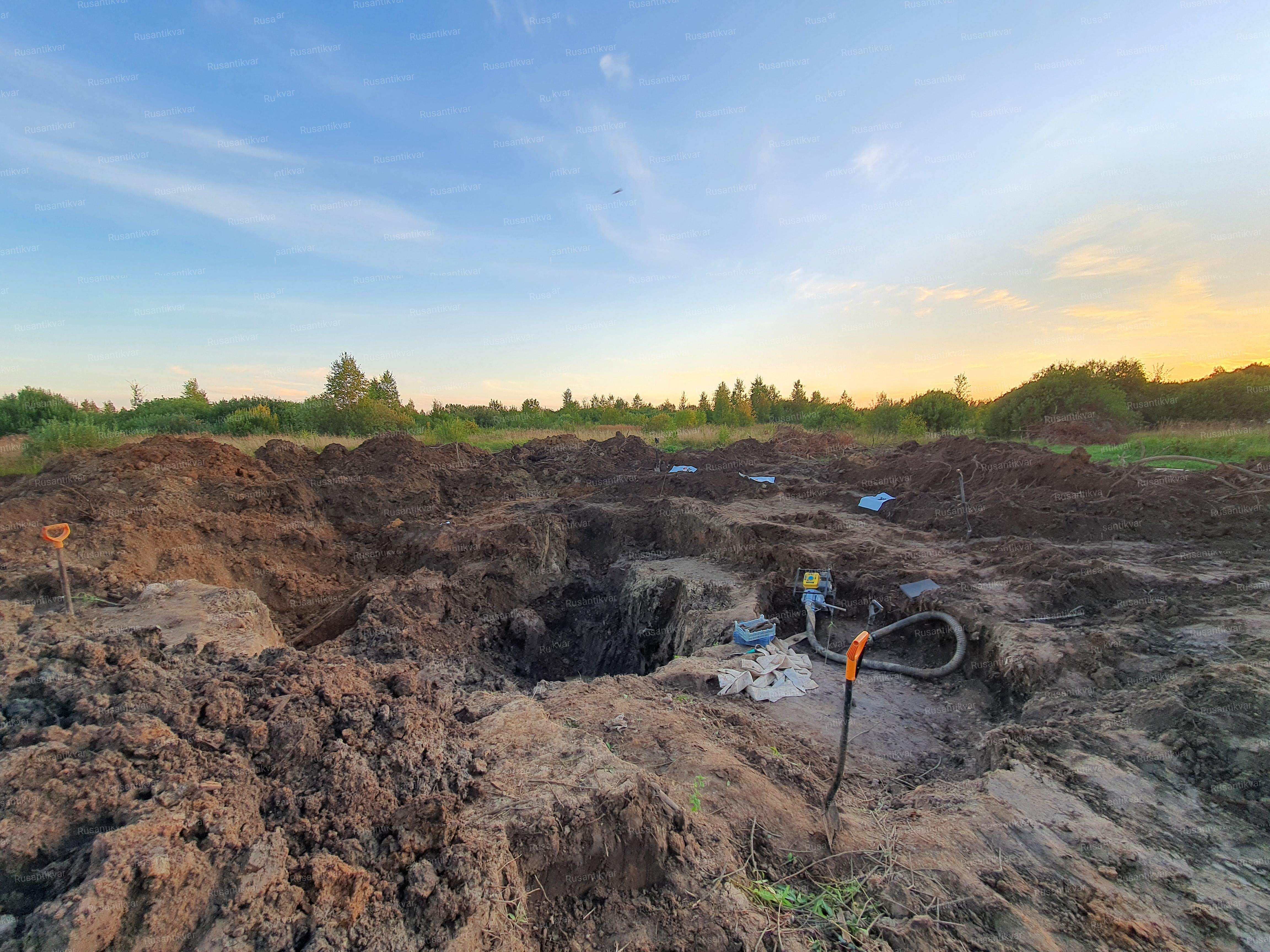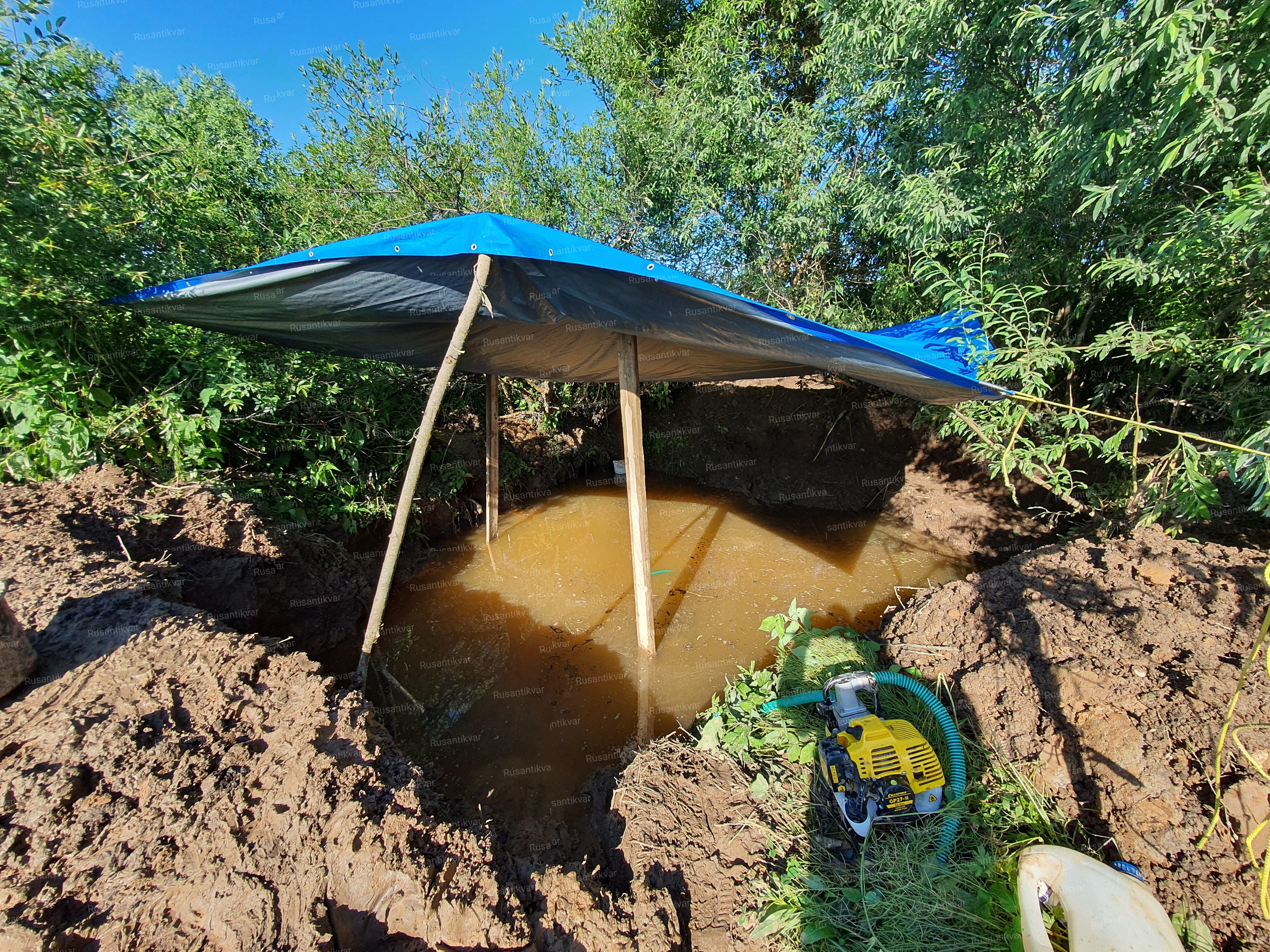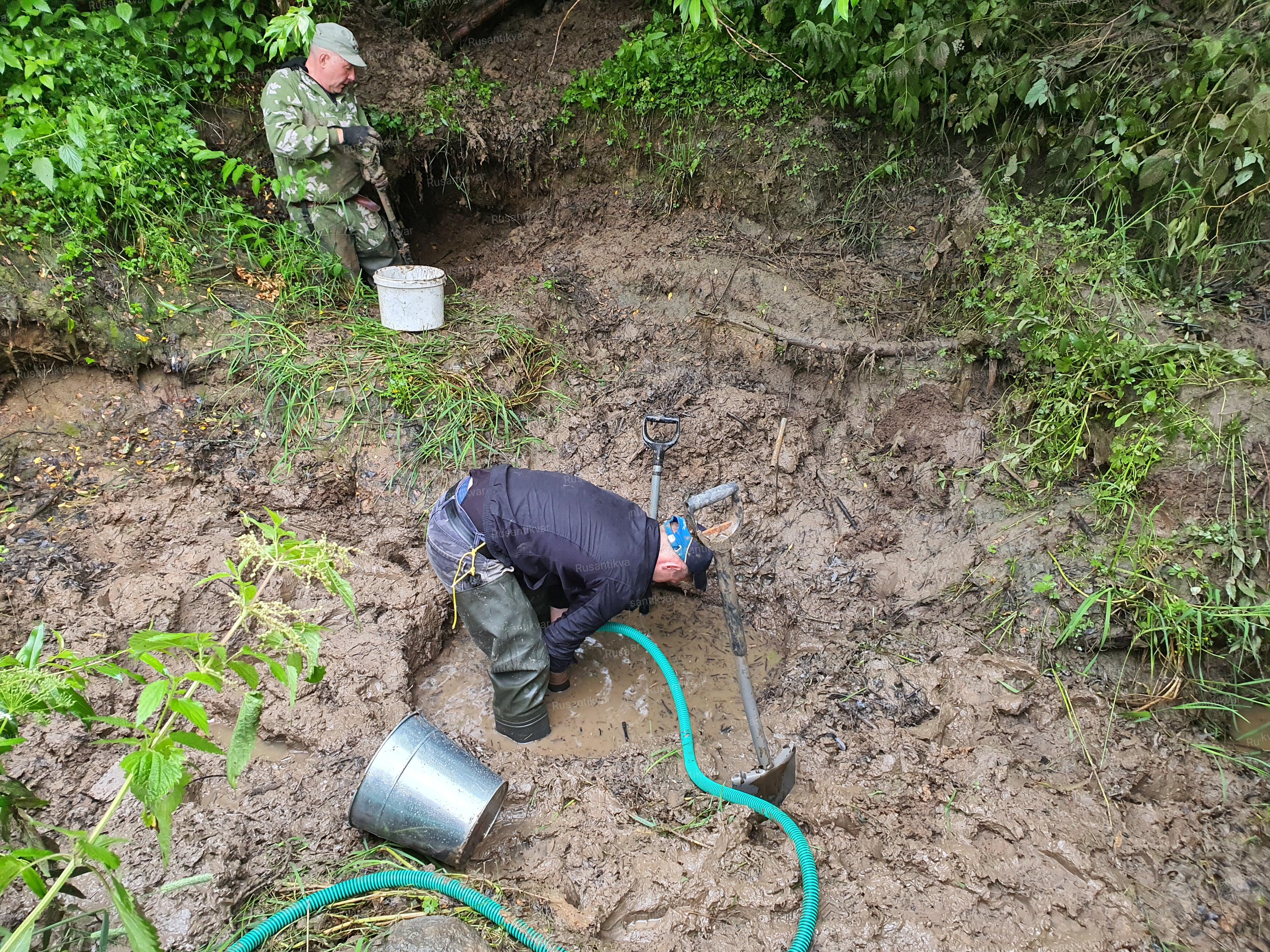Из-за того, что яма была доверху залита водой, пришлось для её отвода выкопать траншею, чтобы хоть как-то помочь помпе. После откачки воды несколько ковшей удалось вынуть из глубины воронки на всю позволяемую длину стрелы трактора.