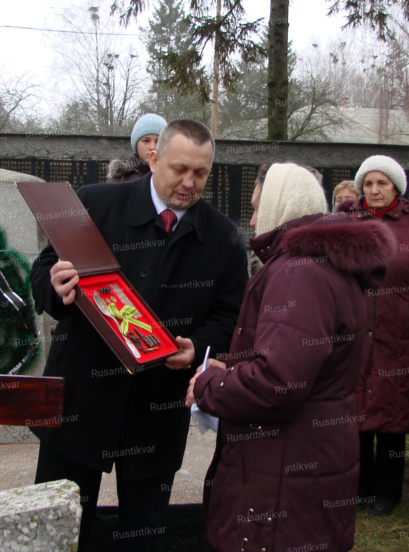 От имени поисковиков отряда «Лужский рубеж» Андрей Лященко передал родственникам бойца медальон, а также его ложку и фляжку. Степана Хруща, отдавшего жизнь за страну Советов, отпевали четверо православных священников: настоятель местной куковичской церкви, настоятель менской церкви, глава местной епархии и иеромонах Серафим из возрождающегося Свято-Никольского мужского монастыря.