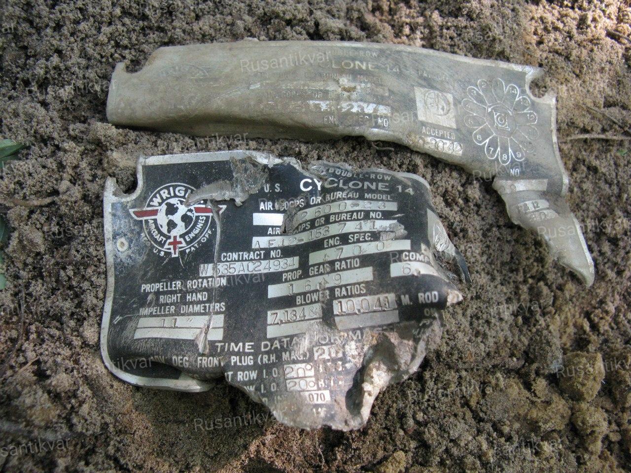 Первую значимую находку сделала Лена, впервые приехавшая со своим мужем на подобное мероприятие, как говорится - новичкам везет. Не веря глазам, мы смотрели на рваную и гнутую металлическую пластинку в ее руке со следами черной краски – заводскую бирку авиационного мотора Райт-Циклон американского производства. Сквозь налипшую грязь виднелась надпись «AIR CORPS OR BUREAU NO.» и выбитые символы в светлом поле ниже этой надписи - AF42 - 153741. Быстро нахожу копию аварийного акта, найденного в ЦАМО в начале этого года. Так и есть, номер одного из моторов в акте полностью совпадает с маркировкой! Но как она сохранилась после такой катастрофы!? Все найденные обломки мотора умещаются на ладони, большая часть из них сильно оплавлена, а сорванная с корпуса табличка хоть и пострадала, но сохранила всю информацию необходимую для подтверждения информацию.