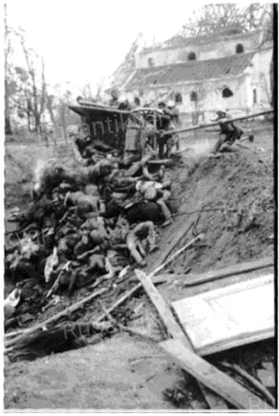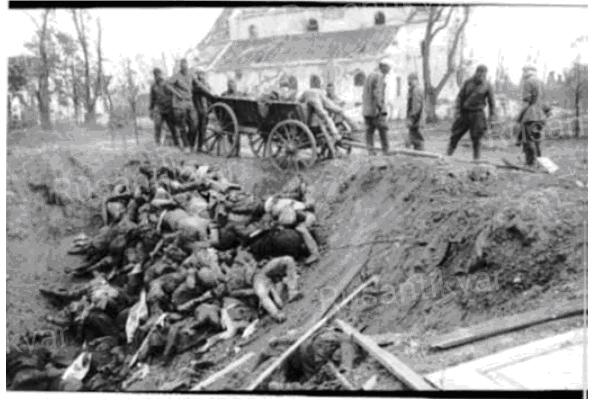 На форуме fortification.ru/forum были помещены интересные фотографии. На них изображено как военнопленные сбрасывают трупы своих товарищей - павших защитников крепости в большую воронку. Из фотоснимка видно, что в воронку сброшены тела около 40 - 50 человек. На заднем плане хорошо опознаются стены бывшего гарнизонного костела (ныне Свято – Николаевский гарнизонный собор). Судя по большим размерам - это воронка от крупной авиабомбы либо от снаряда мортиры системы «Карл».