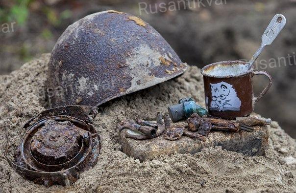Эта новость нас очень обрадовала, и мы с особым трепетом продолжили работу по археологической расчистке останков. Все личные вещи погибшего собрали в отдельный контейнер. У молодого лейтенанта нашли не отстрелянный полностью диск для ППШ, два курительных мундштука, осколки разбитой стеклянной фляги, эмалированную кружку с изображением кота и ложку, благодаря которой его и опознали. В районе груди погибшего находился знак ГТО («Готов к труду и обороне»).