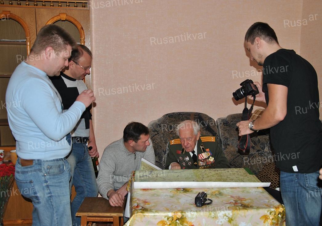 Приехали мы не с пустыми руками, а приготовили необычные подарки. И теперь гадали и переживали, угодим или нет. Во-первых, мы привезли ММГ 76-мм артиллерийского снаряда, который был обнаружен нами недалеко от деревни Полунино. Сапёры после войны его обезвредили, но таскать тяжёлые болванки им было, видимо, лень. И они просто закопали корпус снаряда, а мы нашли. Другим подарком были военные карты Ржева и окрестностей за июль-август 1942 года с нанесёнными пометками и разведданными. Мы напечатали точные копии тех карт, которыми Михин наверняка пользовался, командуя батареей.