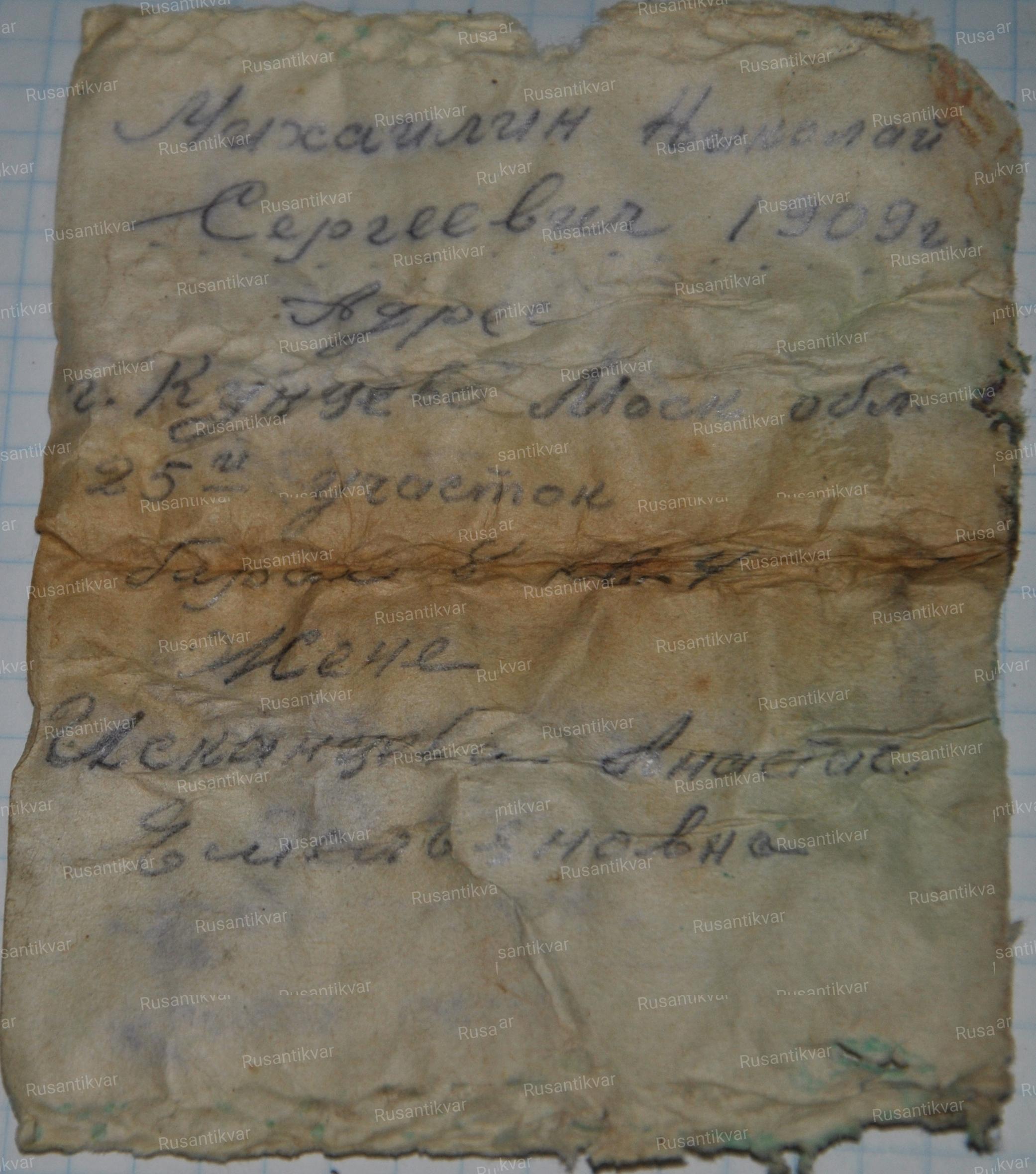 Июль выдался жаркий и сухой. 20-го числа в один из выходных, мы снова приехали под Ржев. Главной целью поездки было выбрать место стоянки лагеря на осеннюю экспедицию, а всё оставшееся время, конечно же, посвятить поиску бойцов. За два дня мы нашли и подняли из земли четырёх солдат, но самое главное, что один из них был именным. И в самодельной записке медальона мы прочли: «Хазов Егор Васильевич, красноармеец роты автоматчиков 431 с/п, домашний адрес Горьковская область, Больше-Болдинский район, Язовский сельсовет, передать Хазовой Анне Ефтеевне».