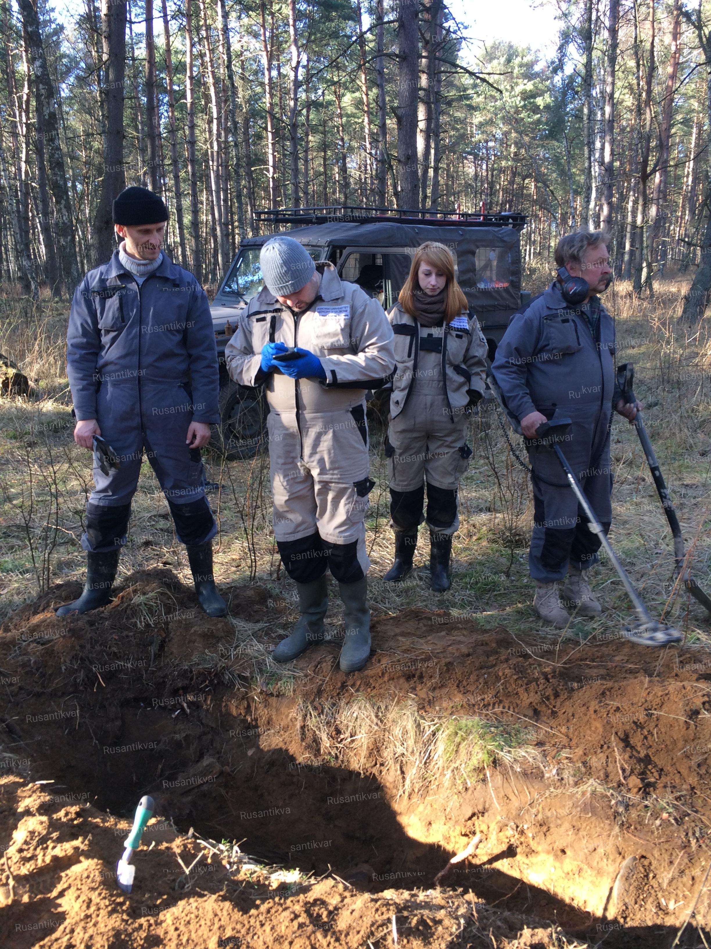 Сборы были недолгими, и 8 марта, преодолев расстояние в две с небольшим тысячи километров, мы были на месте. Зимы в этом году поляки насчитали аж целых две недели, поэтому, ни а каком снеге и замершей земле не могло быть и речи. Нас встретило весеннее солнце и +15 - рай для поисковика. Могила находилась на обочине дороги, буквально в трех метрах. После первых выброшенных комьев земли, показалась вода, и «поисковый рай» закончился. Обидно, что в пробных шурфах вокруг было сухо, а тут... Выкопали слив, отвели, насколько смогли воду, но об археологическом подъёме не могло быть и речи. «Чёрные» поработали хорошо, если можно так сказать, практически все останки были вытащены, а потом закопаны обратно. Не надеясь найти каких-либо артефактов (все забрали до нас), мы перебирали жижу, извлекая мелкие фрагменты костей, и откачивали воду. На самом дне часть скелета солдата оказалась нетронутой, там удалось обнаружить портсигар, расчёску, чернильницу, несколько советских монет, нательный крестик, ложку и 45-мм снаряд.