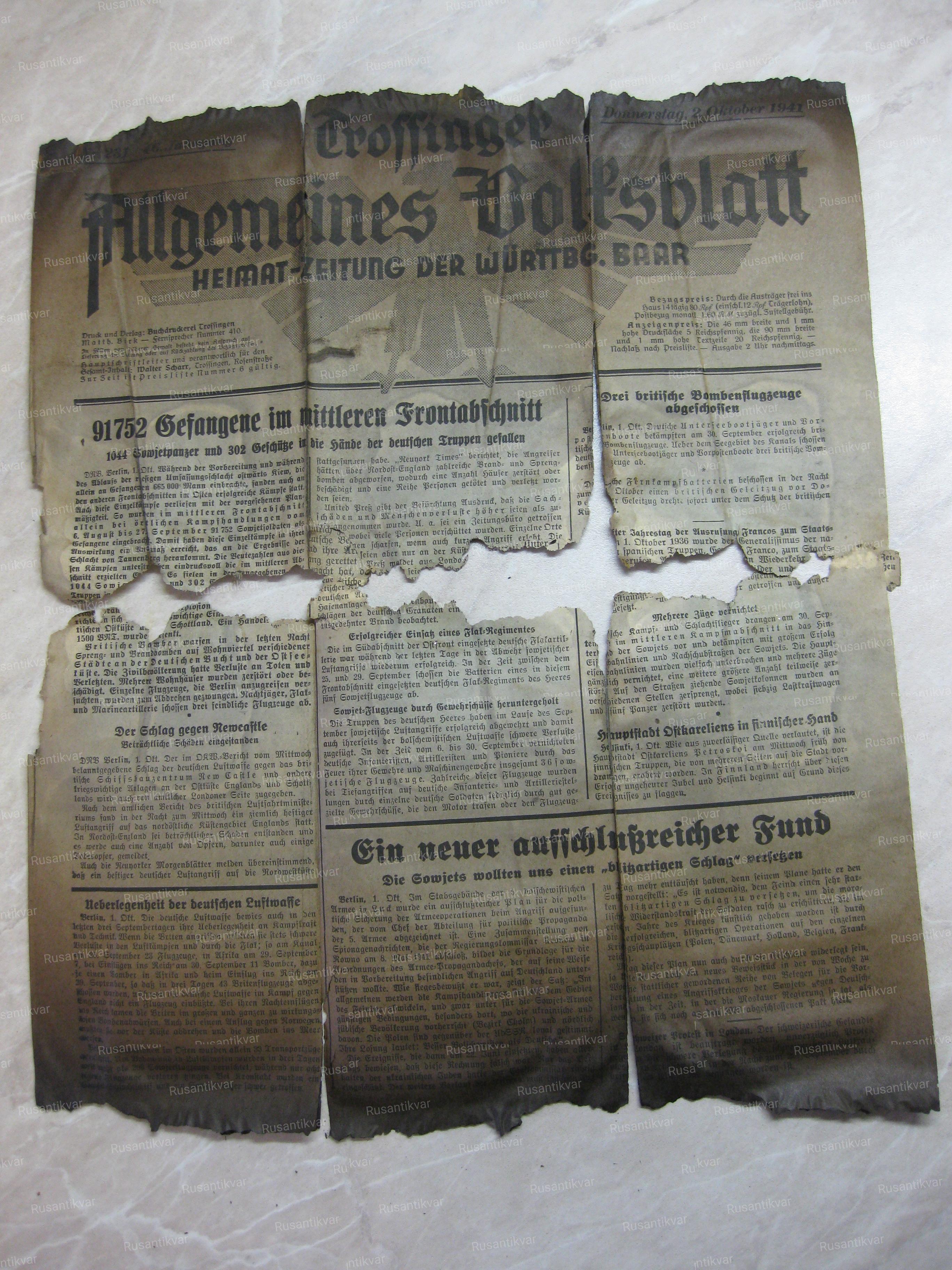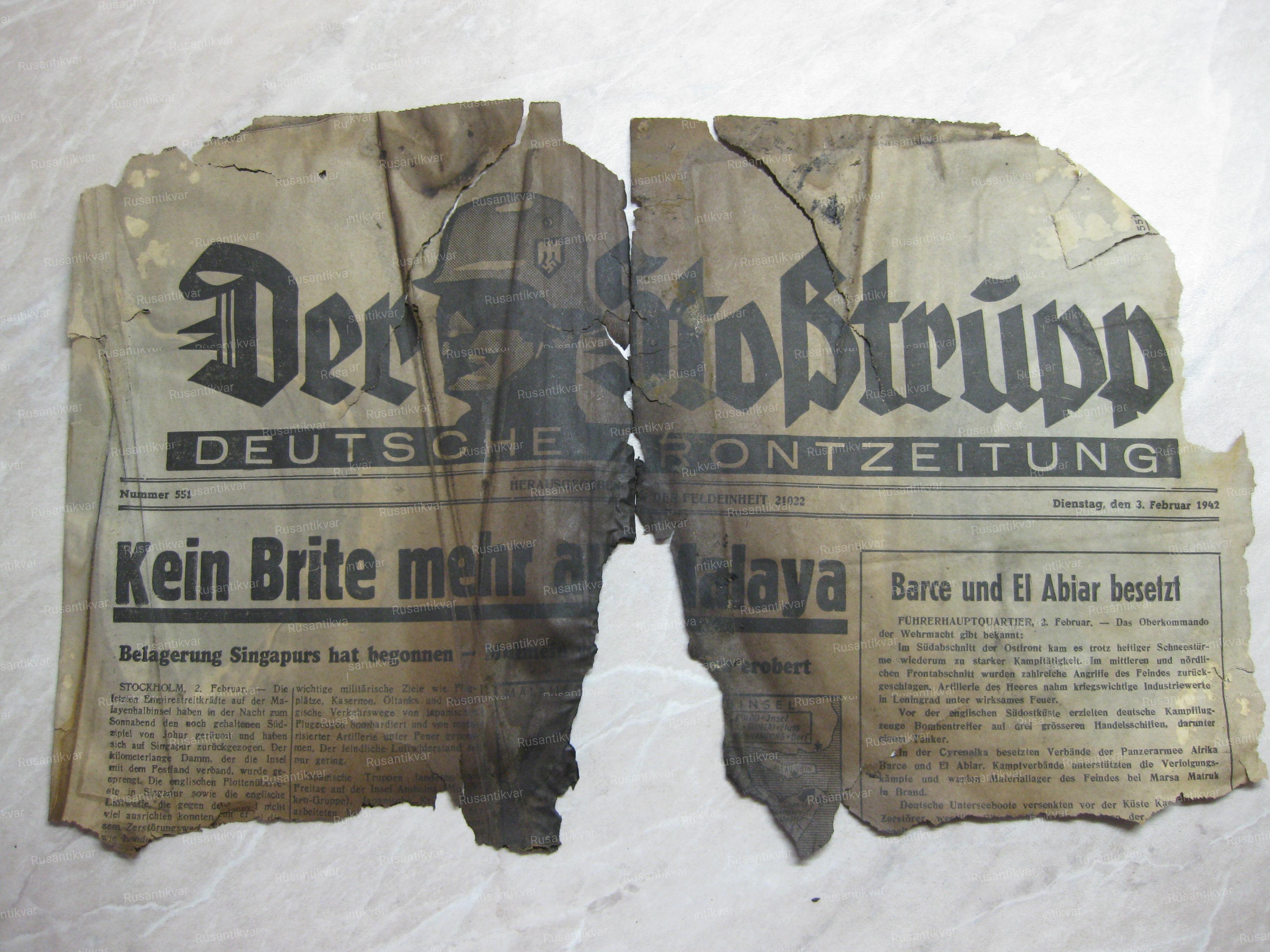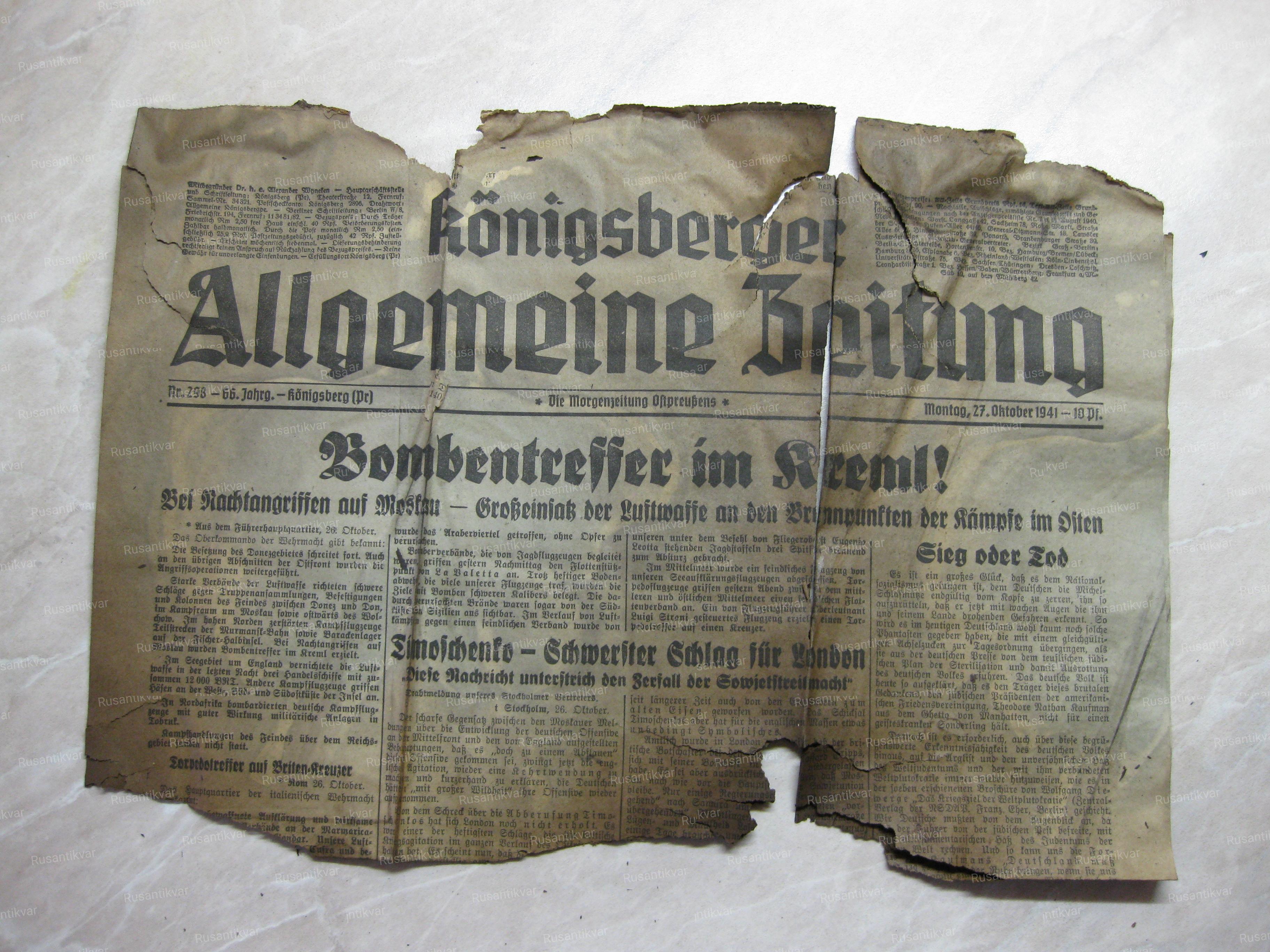 Что можно сказать сразу – немецкая окопная пресса выглядела явно разнообразнее нашей. Кипа из блиндажа была представлена четырьмя разными изданиями: «Троссингская общая народная газета», «Кёнигсбергская общая газета», немецкая фронтовая газета «Ударная группа» и Штутгартский национал-социалистический курьер. Образцы многих газет повторялись по несколько раз, и, помимо всего прочего в кипе попадались отдельные обрывки газет, исписанные цифрами тетрадные листы и потемневшие от перегрева листовки.