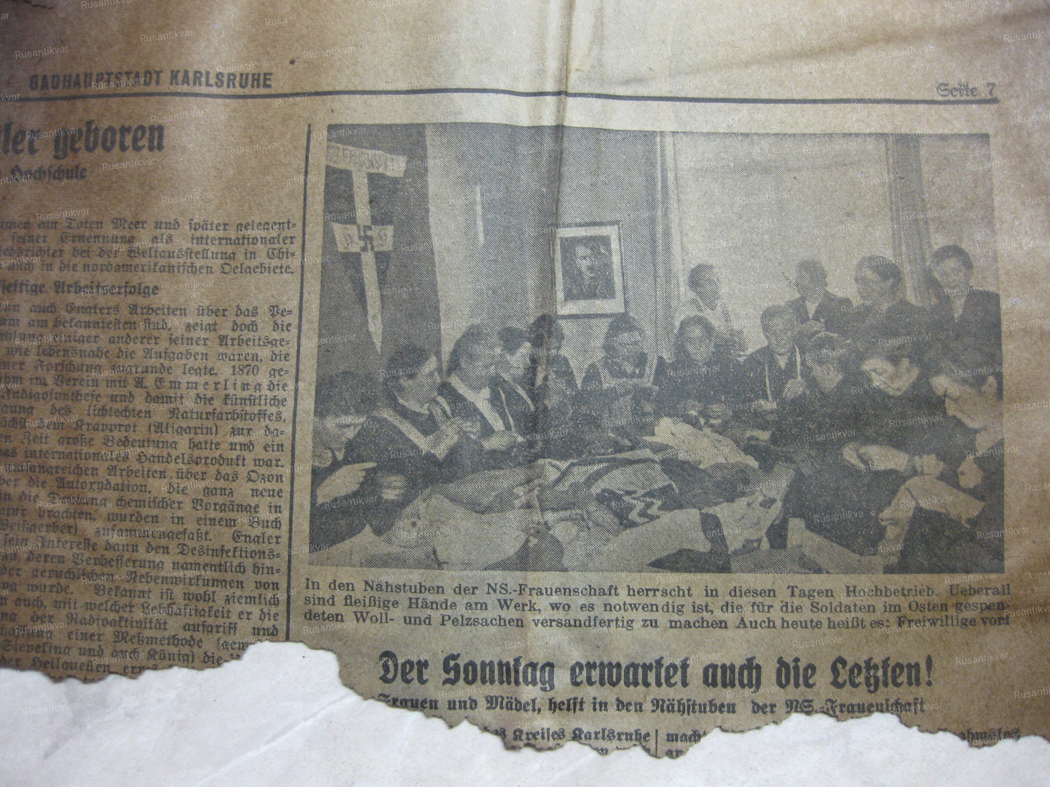 9. «В эти дни в швейных мастерских Женского Национал-социалистического союза кипит напряженная работа. Всюду прилежные руки заняты работой, потому что необходимо подготовить к отправке шерстяные и меховые вещи, собранные для солдат на Востоке. И сегодня звучит девиз: «Добровольцы – вперед!».