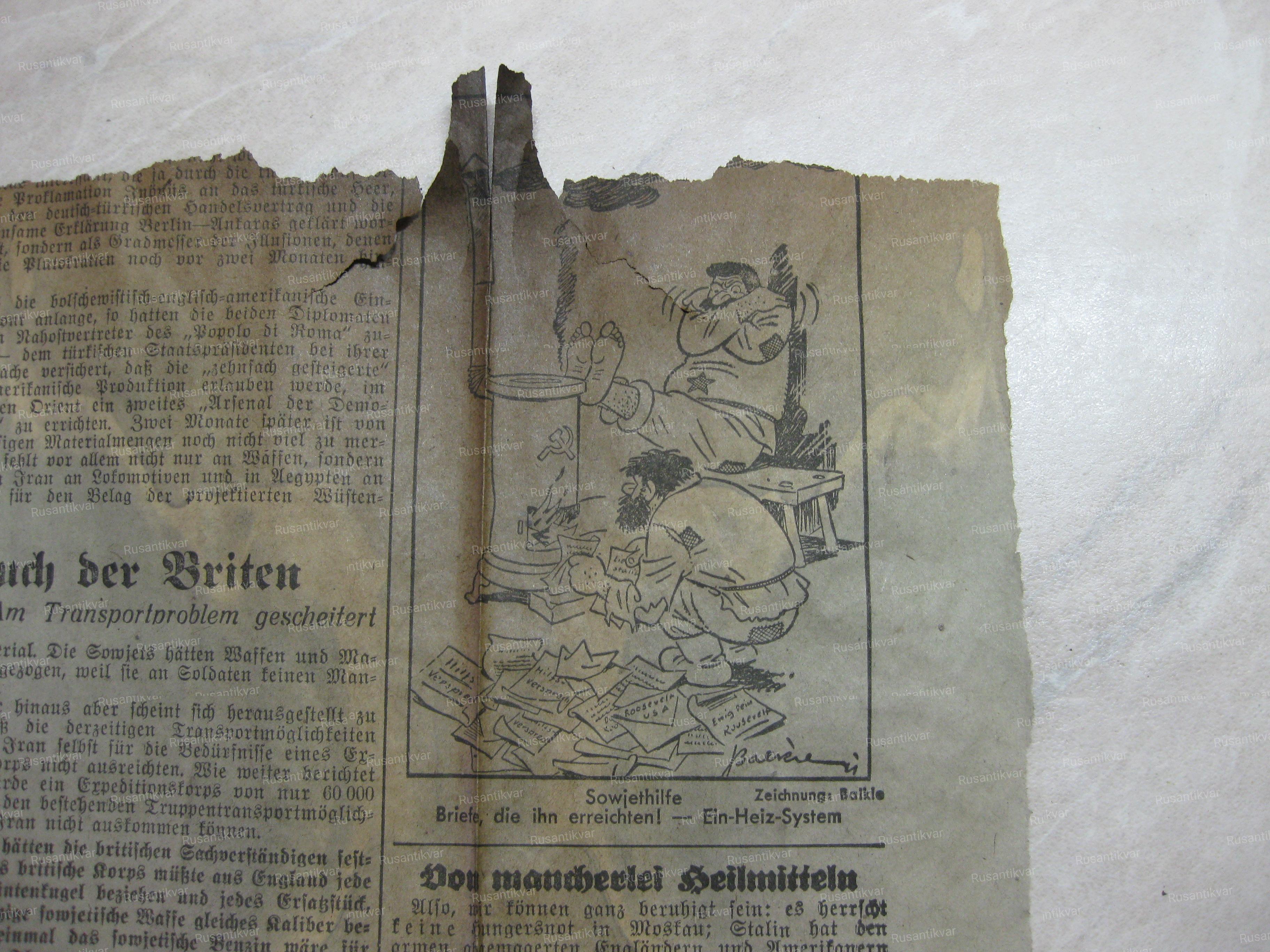 К сожалению, перевести на русский язык все газетные материалы мы не имеем возможности, но на примере этих ярких заголовков становится ясно, что немецкая пресса того времени не сильно отличалась от советской. Не стала исключением и публикация колких карикатур на И. Сталина и будущих заокеанских союзников и фотографий с фронта или тыла, поднимающих боевой дух солдат противника.