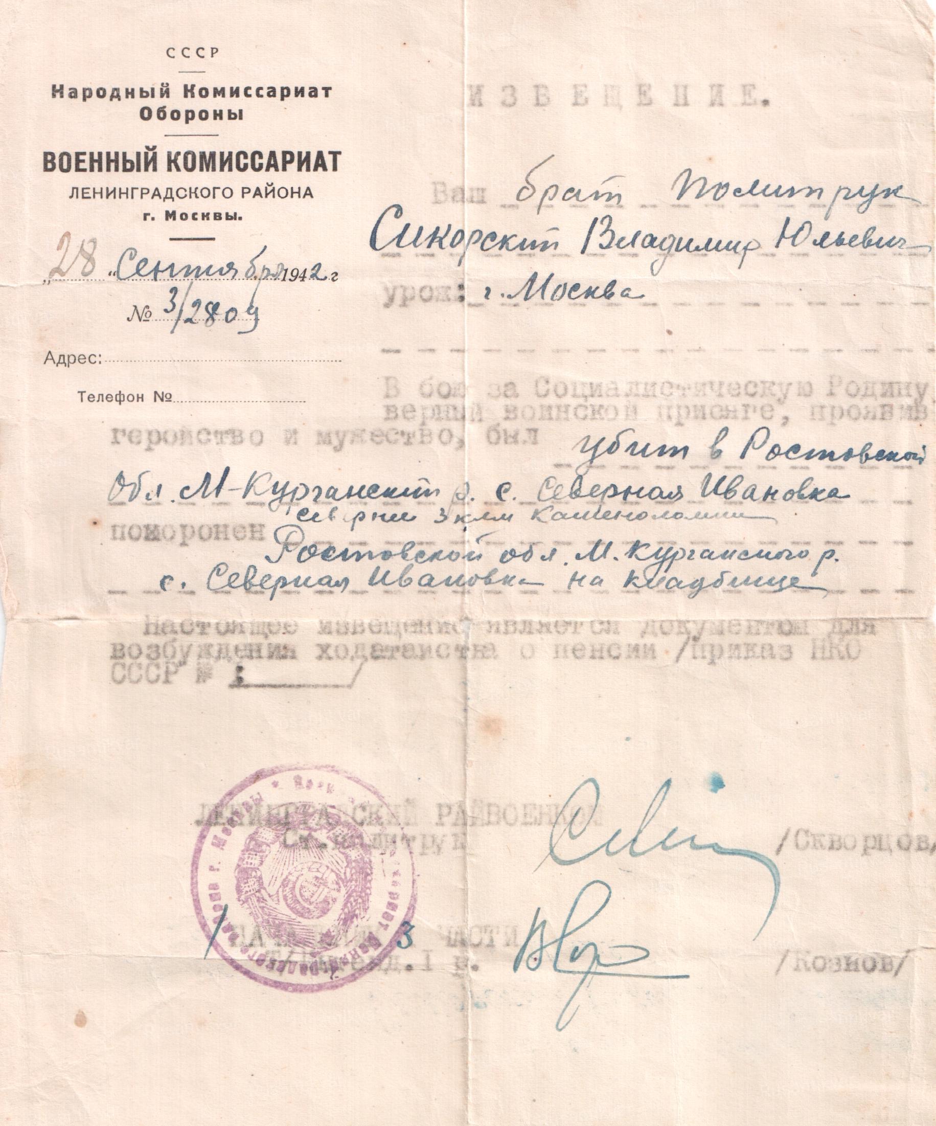 2. Извещение о гибели В.Ю. Сикорского, сентябрь 1942 года.