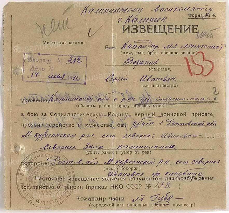 3. Извещение о гибели С.И. Воронина, май 1942 года.