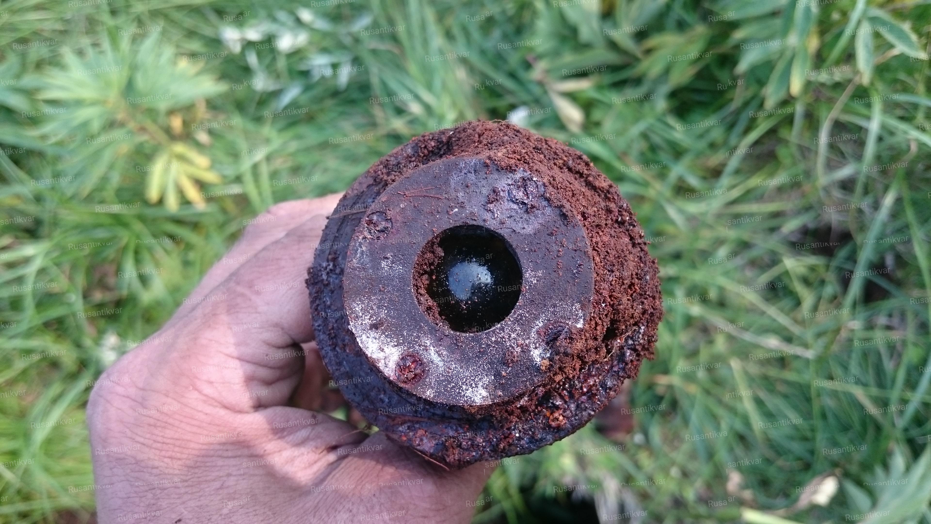 На склоне под землей вблизи от ручья и дороги, которые связывают мыс Курбатова и высоту Северную, мы нашли взрыватели к морским противодесантным минам. Внутри у них сохранилась жидкость, которая воспламеняется при взаимодействии с воздухом. В этом схроне также находились несколько десятков электродетонаторов к противодесантным минам.