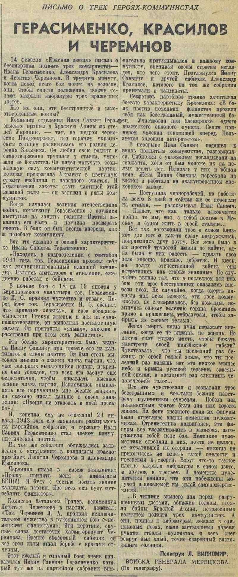 «Доношу, что в боях за деревню Копцы бессмертный подвиг совершили коммунисты – красноармейцы Красиков, Черемнов и сержант Герасименко, которые не пощадили жизни для победы над врагом…».
