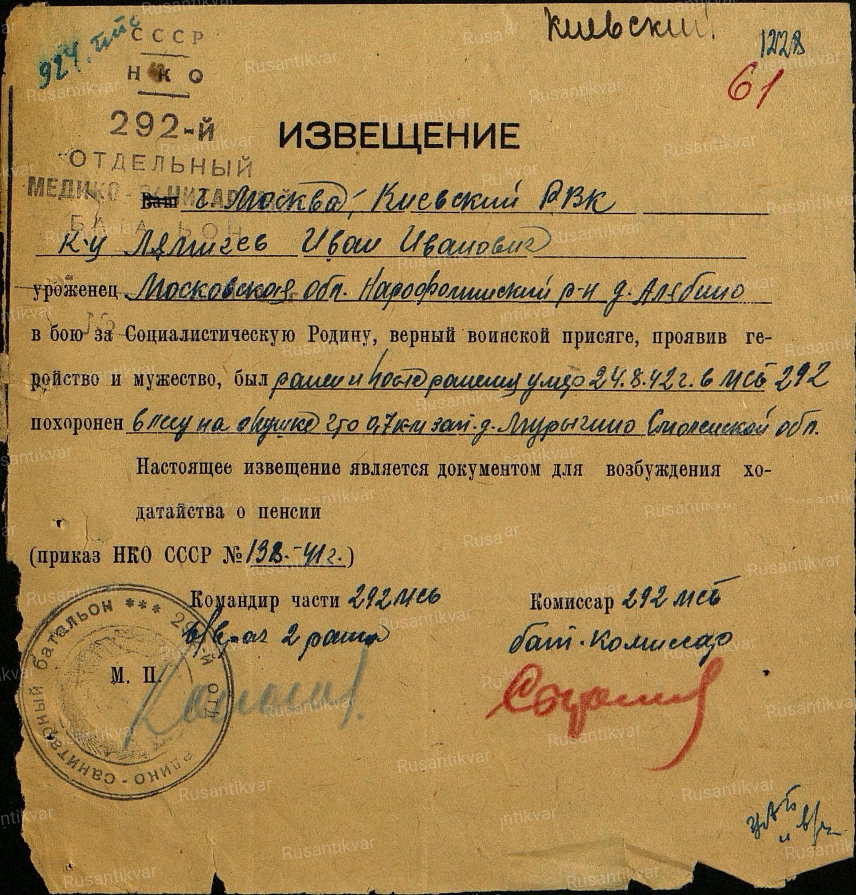 2.Извещение о воине, умершем от ран в 292-м медсанбате.