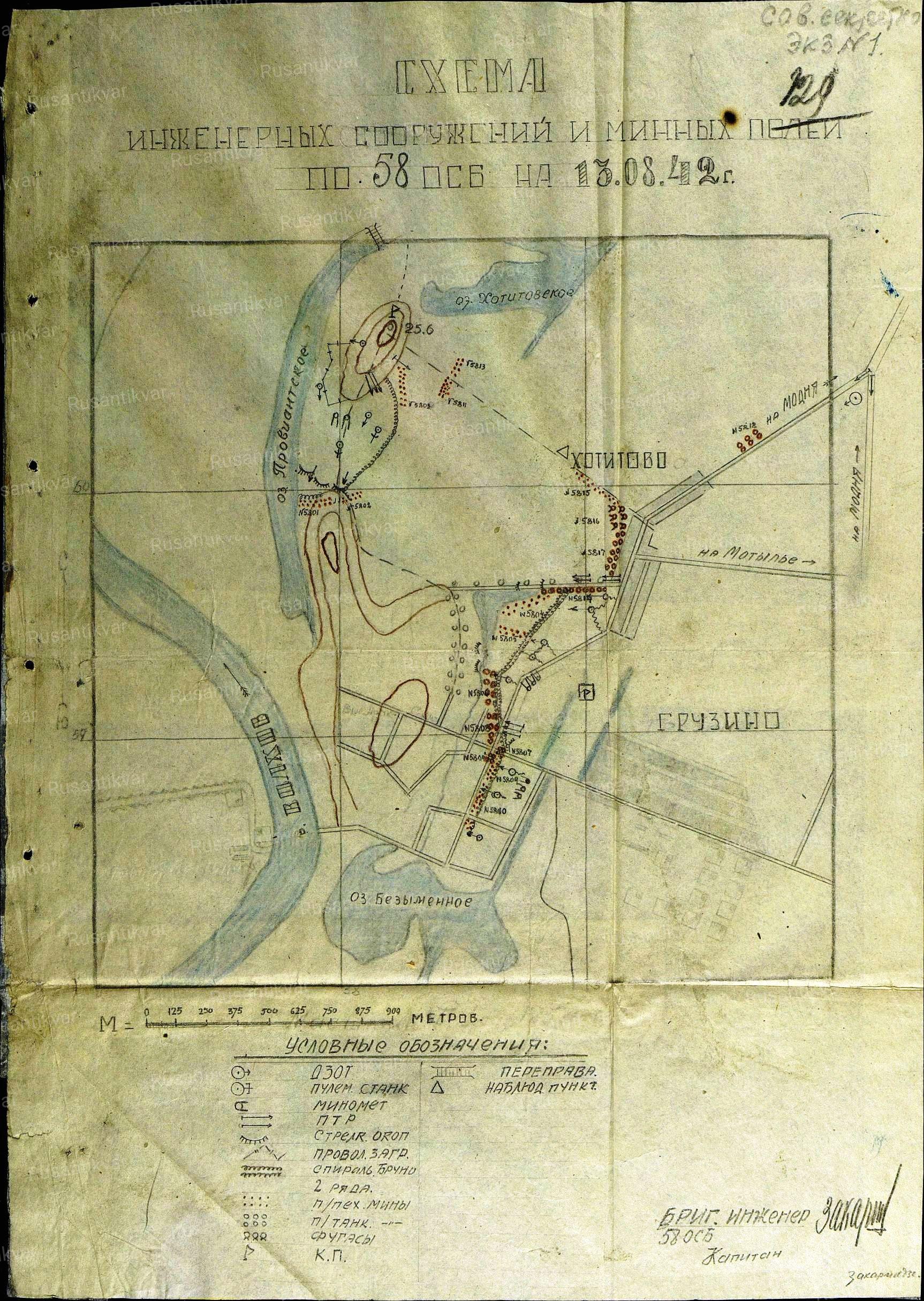 Рисунок 2. Схема инженерных заграждений и минных полей по 58-й стрелковой бригаде в районе Грузино по состоянию на 13.08.1942 г.