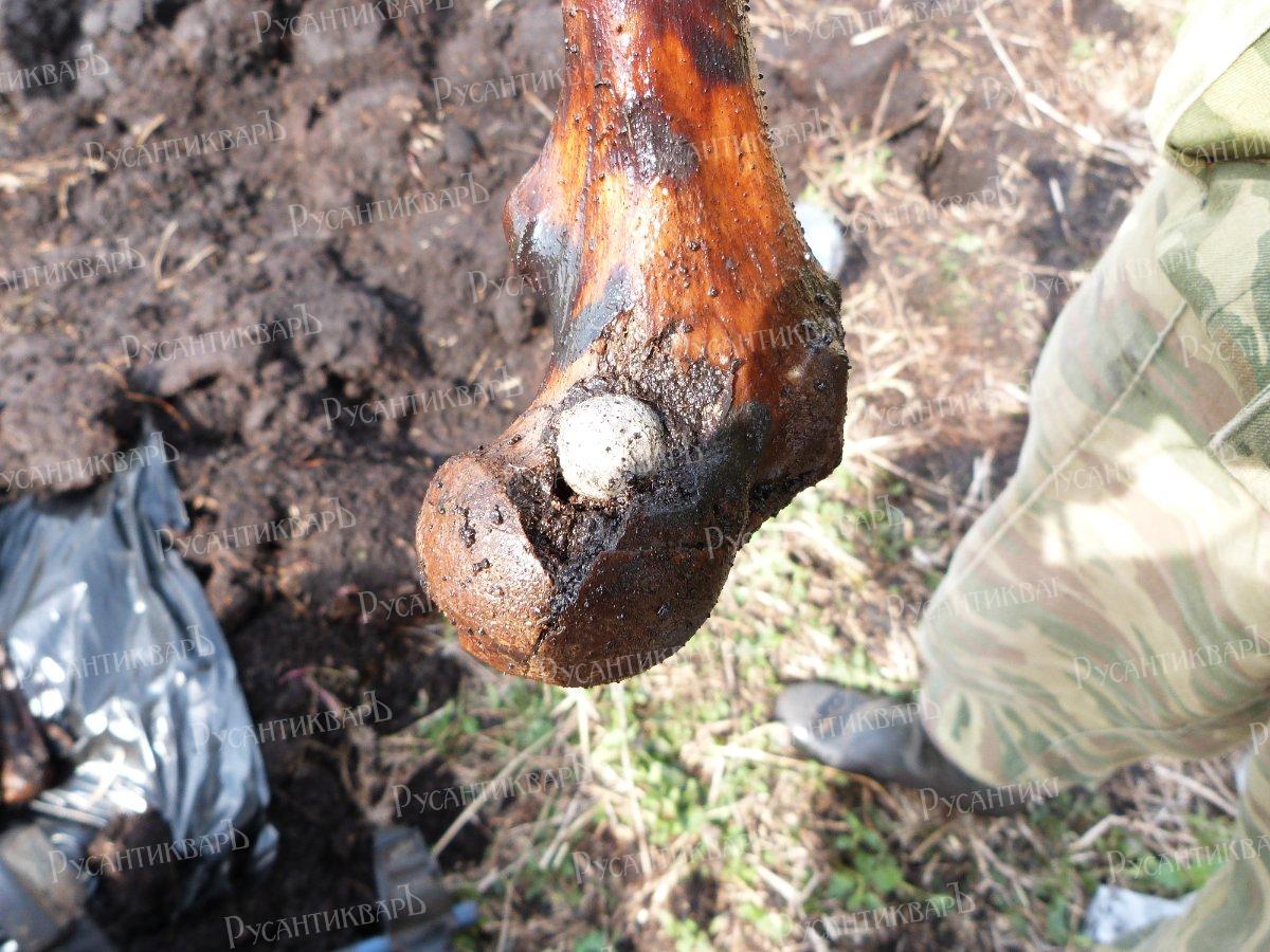 8.Свинцовая ружейная пуля, застрявшая в бедренной кости воина.