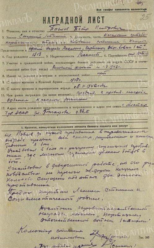 Благодаря помощи коллег с форума сайта «Солдат.ру» удалось разыскать наградной лист за подписью командира партизанского соединения подполковника Капусты Ф.Ф. о представлении старшего лейтенанта Павлова П.П., начальника штаба партизанского отряда имени Котовского к медали «Партизану Отечественной войны I степени».