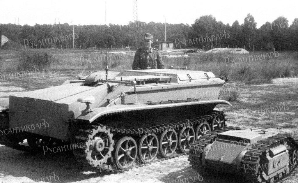 Немцы в апреле 1942 года обзаводятся такой подвижной миной на гусеничном ходу - leichte Ladungstraeger B-III «Goliath». Она имела габариты 1.5 х 0.85 х 0.56м, вес 370 кг. Заряд взрывчатки составлял 60 кг тротила или пентрита. Она имела два электромотора по 2.5 квт мощностью каждый. Питание моторы получали от 12-вольтовых аккумуляторов. Управление и инициирование взрыва осуществлялось посредством кабеля связи длиной 1.5 км. Катушка с кабелем помещалась в мине и провод разматывался по мере движения мины. Скорость могла достигать 10 км в час. До января 1944 года фирмы Боргвард и Цюндап выпустили в общей сложности 2650 мин «Голиаф». ФОТО 1, 2 ,3, 4