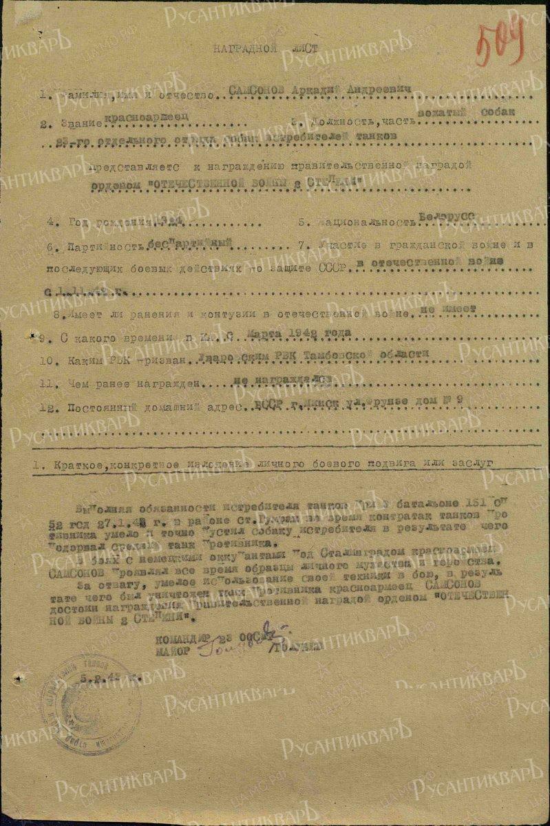 10. Наградной лист на красноармейца А.А. Самсонова за подрыв танка.
