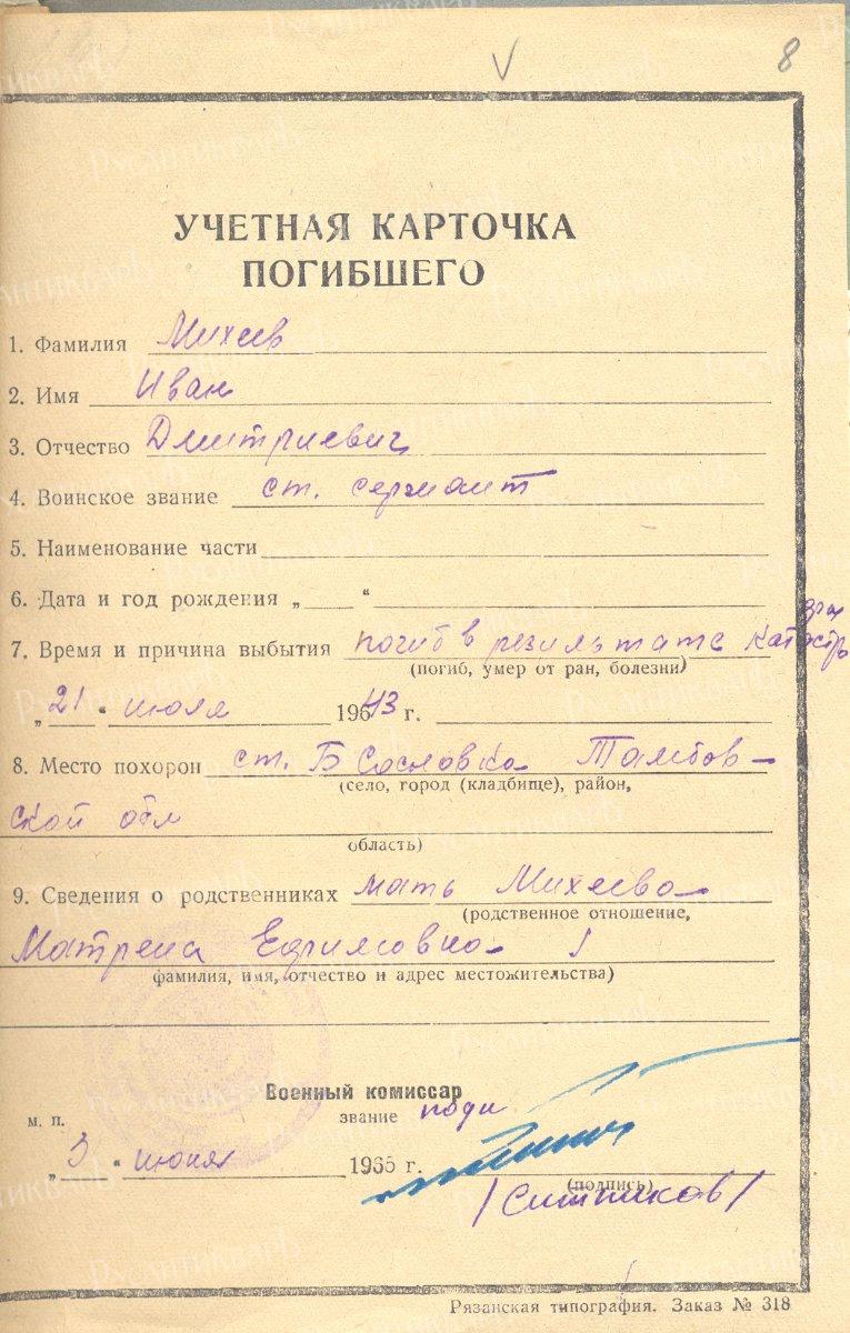 На стеле братской могилы на кладбище поселка Сосновка есть имя Михеева Ивана Дмитриевича, уроженца Рязанской области. Пилот призывался из Москвы. На момент гибели (21.07.1943 г.) служил в 17-ом УТАП, который базировался близ поселка Сосновка. В Сосновском военкомате сохранилась учётная карточка погибшего, но от 1965 года. В карточке значится «место захоронения: ст. Б. Сосновка (станция Бенкендорф-Сосновка?), Тамбовской области». В донесении о безвозвратных потерях от 13.08.43 г. написано «место захоронения: Тамбовская обл., Мичуринский р-н, Больше-Сосновский с/с, с. Большая Сосновка». В настоящее время проводится работа по уточнению места захоронения лётчика.