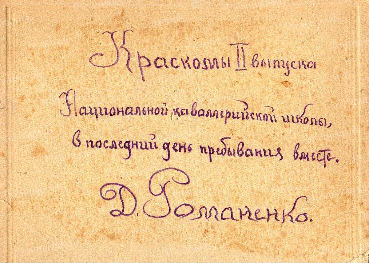 В семейном архиве Романенко хранится старая фотография, датированная 1925 годом, на обороте которой чернилами написано: «Краскомы II выпуска Национальной кавалерийской школы в последний день пребывания вместе». С пожелтевшего от времени фото смотрят на нас улыбающиеся лица молодых ребят, среди которых четвертый справа в нижнем ряду Дмитрий. Они счастливы своими достижениями и ещё не случившимися свершениями, но никто из них не догадывается, какая трудная судьба им уготована. Большинство сложат свои головы на фронтах Великой Отечественной войны.