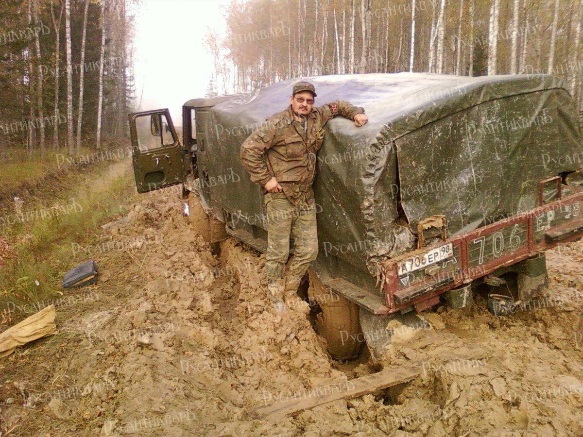 Пока ребята докапывают яму, решаем, всё-таки, налегке попробовать пробиться к перекрестку «Мерседес». Садимся в ГАЗ-66. Хюппенен пристроился «на броне» - на запасном колесе между кабиной и кузовом. Оттуда замечательный обзор. Главное, вовремя от веток и нависающих над дорогой стволов деревьев увернуться! На этот раз за штурмана в кабине Женя Ротарь. На левом рукаве свежепришитая нашивка с ярко - красной звездой и надписью «Северо-Запад». Он недавно влился в наши ряды. Увлекался поиском монеток на старых урочищах. Но посетив наш поисковый музей «Военной археологии» у стадиона «Петровский» стал вместе с нами ездить на поисковые работы. 66-й натужно ревет двигателем, вращая огромные колеса, облепленные глиной так, что не видно никаких протекторов. Попытка ходом проскочить очередную лужу кончается оторванным правым зеркалом и мощной вмятиной на двери. Но боевые шрамы только украшают этот военный автомобиль. Выбираемся из грязи на лебёдке.