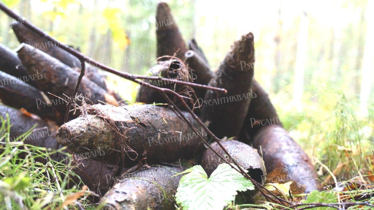 Вот и заветный перекрёсток. Лес вокруг подтоплен бобрами. Поэтому поиски солдат сильно затруднены. Но по итогу делаем вывод - сухим летом сюда доехать можно! Это радует. Поворачиваем на перекрестке «Мерседес» на Погостье. С помощью лебёдки преодолеваем ещё несколько сотен метров. Дорога превратилась в сплошную торфяную реку, слегка заросшую сверху камышами. Приходится оставить машину и идти по дороге пешком. Точнее вдоль дороги, по лесу, так как сама дорога, по сути, это жидкое болото залитое водой и поросшее камышами. И это несмотря на «великую сушь» вокруг. Весной здесь совсем беда. Вот прямо из дороги торчат гильзы от орудий. Выкапываем несколько штук. Флак-88! Это немецкая зенитная пушка калибром 88 мм. Немцы использовали их для борьбы с нашими танками прямой наводкой. Грозное оружие. Сколько оно сгубило наших танков!