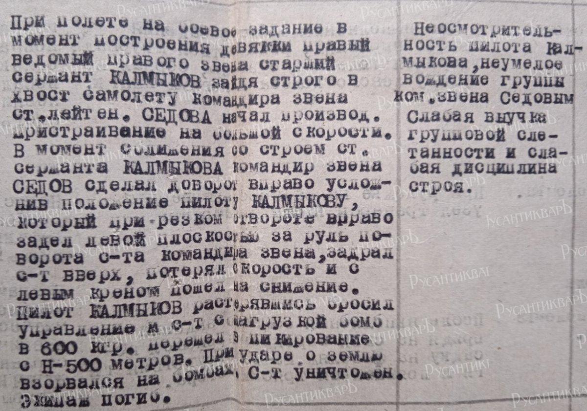 Из акта расследования катастрофы: «При вылете на боевое задание в момент построения девятки правый ведомый правого звена старший сержант Калмыков зашёл строго в хвост самолёту командира звена старшего лейтенанта Седова, и начал производить пристраивание на большой скорости. В момент сближения со строем ст. сержанта Калмыкова, командир звена Седов сделал доворот вправо, усложнив положение пилоту Калмыкову, который при резком отвороте вправо задел левой плоскостью за руль поворота самолёта командира звена, задрал самолёт вверх, потерял скорость и с левым креном пошёл на снижение. Пилот Калмыков, растерявшись, сбросил управление, и самолёт с нагрузкой бомб в 600 кг перешёл в пикирование с Н-500 метров. При ударе о землю взорвался на бомбах, самолёт уничтожен. Экипаж погиб».