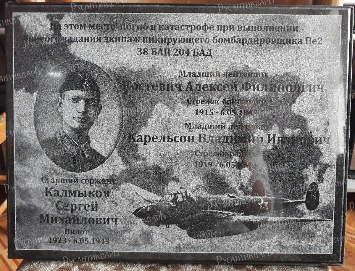 Промывка найденных деталей помогла нам установить номер машины. На одном из лючков красной краской были нанесены заветные цифры 18/144. Благодаря этой информации и помощи авиационного историка и специалиста Бориса Давыдова, нам удалось установить, что на самолёте Пе-2 № 18/144 с моторами 24-2280 и 24-2278 при катастрофе во время полёта по выполнению боевого задания 6 мая 1943 года, погиб экипаж из 38-го авиационного бомбардировочного полка 204-й бомбардировочной дивизии: пилот, старший сержант Калмыков Сергей Михайлович, штурман, младший лейтенант Костевич Алексей Филиппович и стрелок-радист, младший лейтенант Карельсон Владимир Иванович.